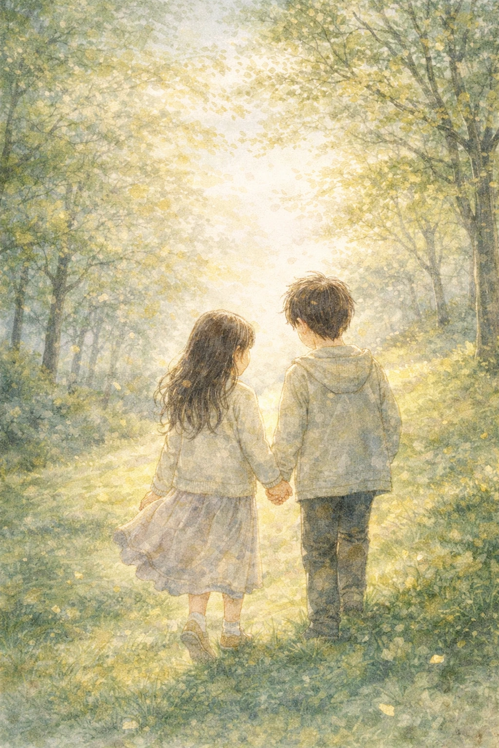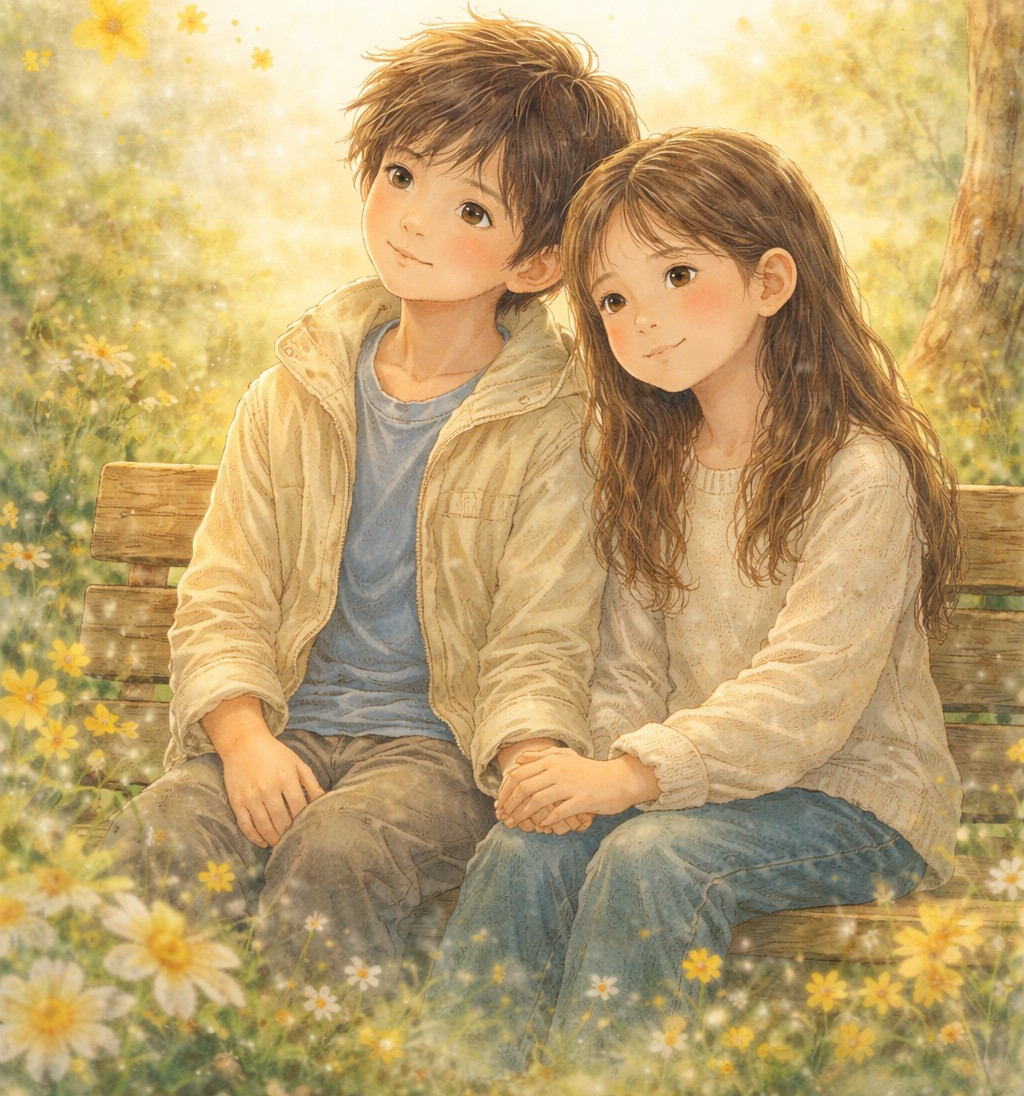 두 아이는 느티나무 아래 벤치에 앉았다.