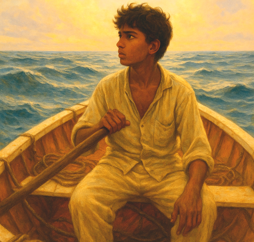 소년 파이는 물 위에 던져졌다.