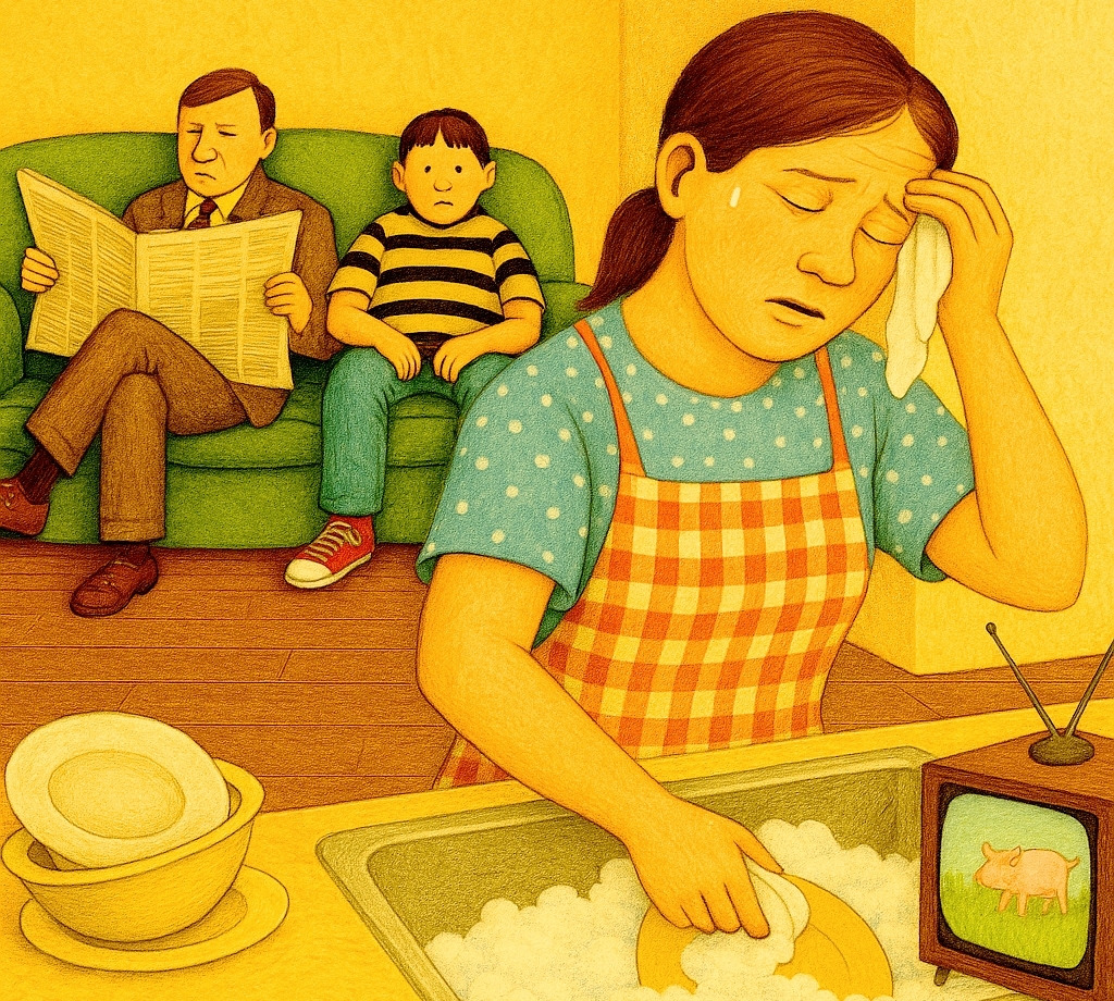 이야기 속 아빠와 아들은 늘 집안을 엉망으로 만들어 놓은 채 소파에 깊게 파묻혀 신문을 보거나 TV를 보고 있었다. 집안일을 도맡아 하는 건 늘 엄마였다.