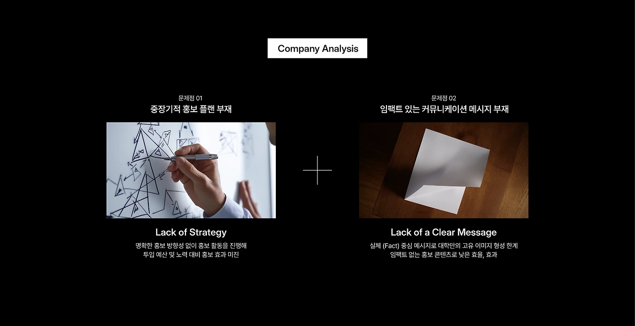 두 학교 모두 중장기적인 홍보 플랜 없이 대학 홍보를 진행하고 있었고 각 대학만의 임팩트 있는 커뮤니케이션 메시지 부재로 고유의 이미지를 형성하지 못한 채 운영되고 있었습니다. 따라서 더 효과적이고 효율적으로 학교의 인지도를 제고하기 위한 홍보전략체계 구축이 필요했습니다.