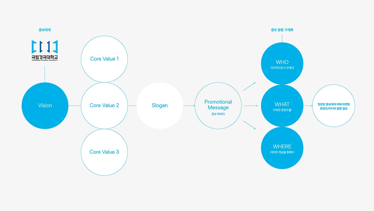 새로운 국립경국대학교의 비전과 핵심가치를 내포한 홍보메시지를 도출하는 작업을 통해 홍보 체계를 구축 하는 작업이 필요했습니다.