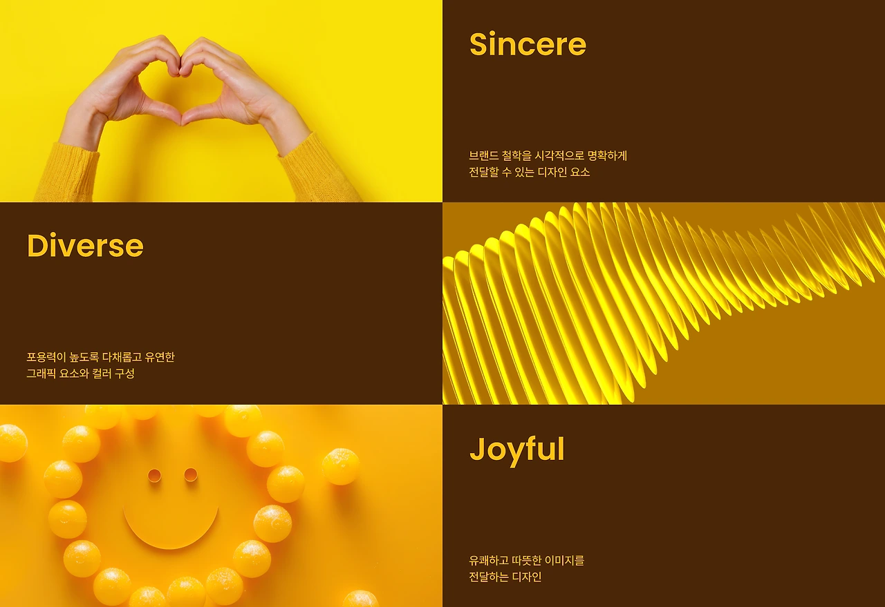 Joyful ; 일상 속 소소하지만 확실한 즐거움을 전하는 브랜드로서, 유쾌하고 따뜻한 이미지가 자연스럽게 전달될 수 있도록 시각적 톤앤매너를 설계하였습니다.