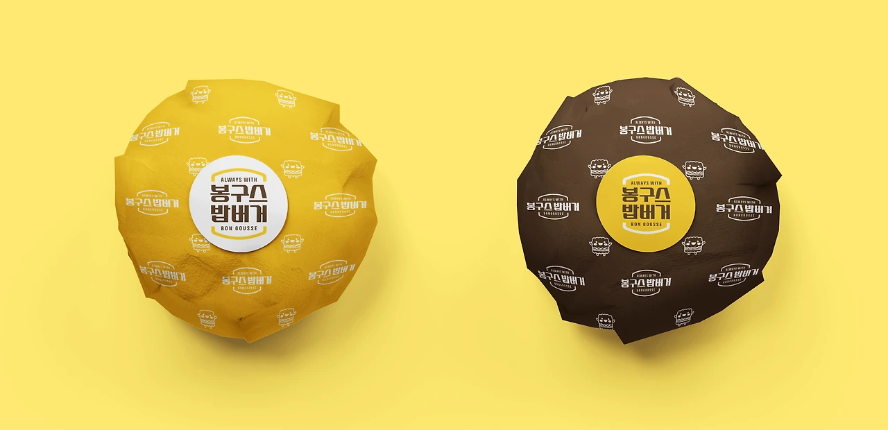 가장 먼저, 브랜드의 중심이 되는 로고 디자인은 봉구스밥버거의 상징인 ‘밥버거’의 형태를 직관적으로 떠올릴 수 있도록 구성하였습니다.