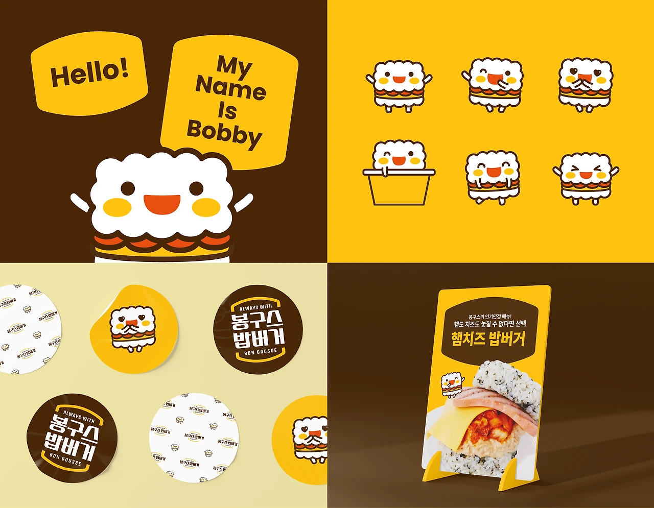 앞서 정의한 키워드를 바탕으로, 봉구스밥버거의 브랜드 이미지를 효과적으로 전달할 수 있는 시각적 시스템을 개발하였습니다.