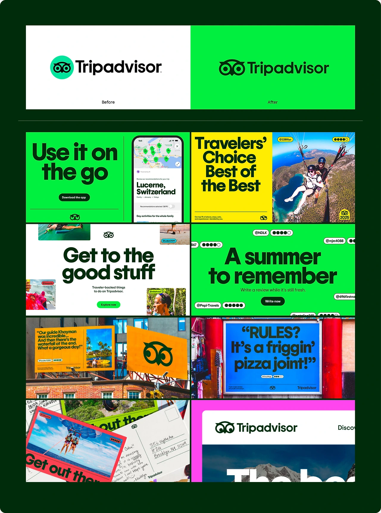 Tripadvisor는 로고와 색상, 마스코트를 단순화하면서도 ‘여행의 즐거움은 사람들의 이야기에서 온다’는 본질을 더 명확히 전달했습니다.