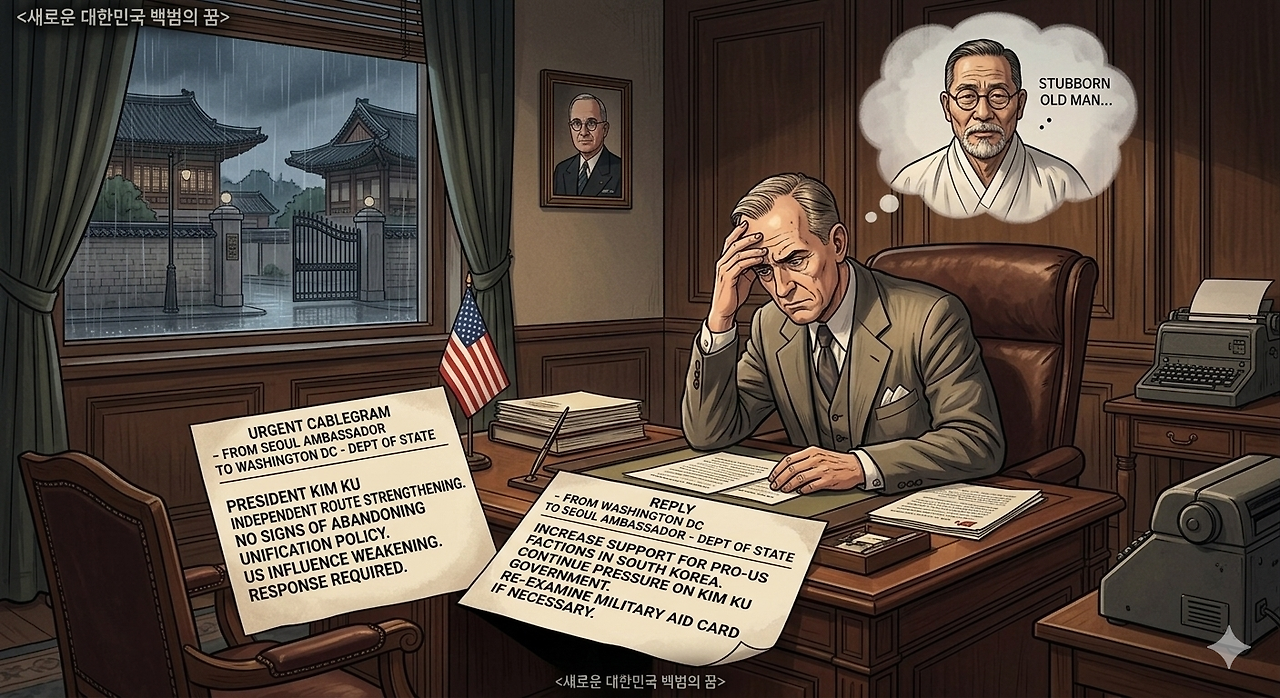 "김구 대통령은 현실을 모릅니다! 북한은 이미 소련의 괴뢰가 되었습니다! 그들과 대화한다는 것 자체가 순진한 환상입니다!"