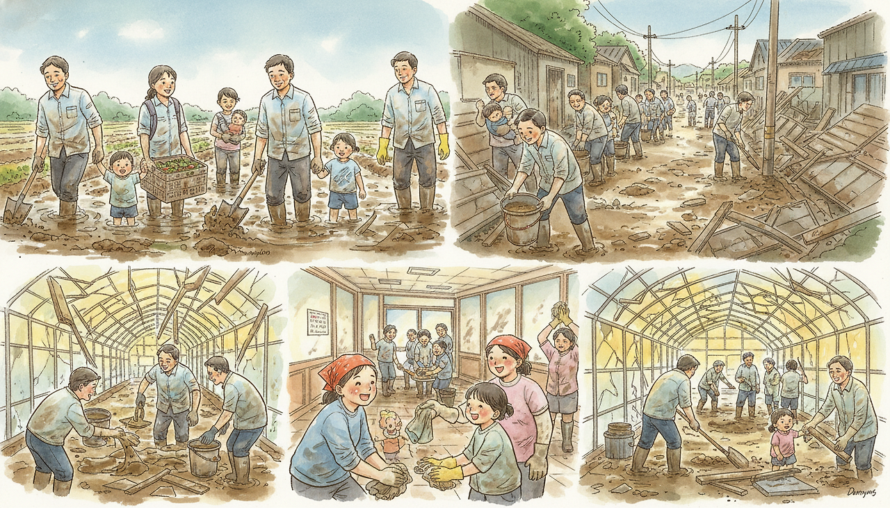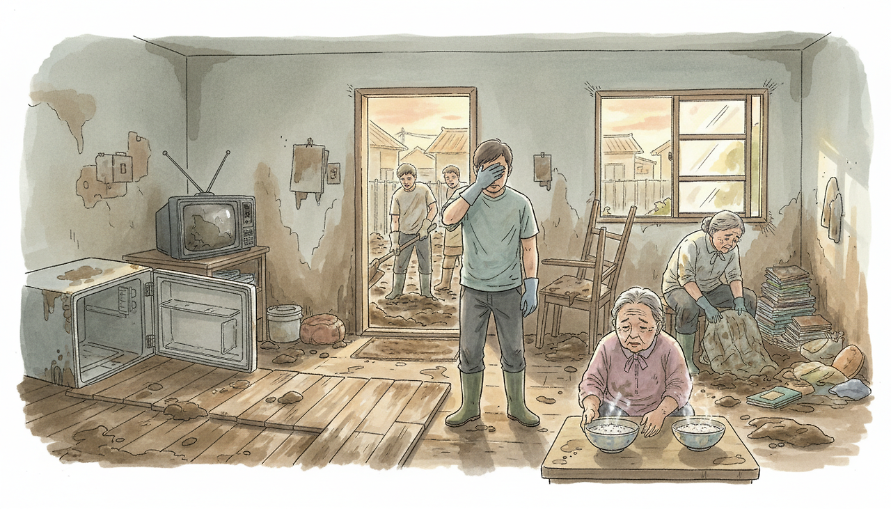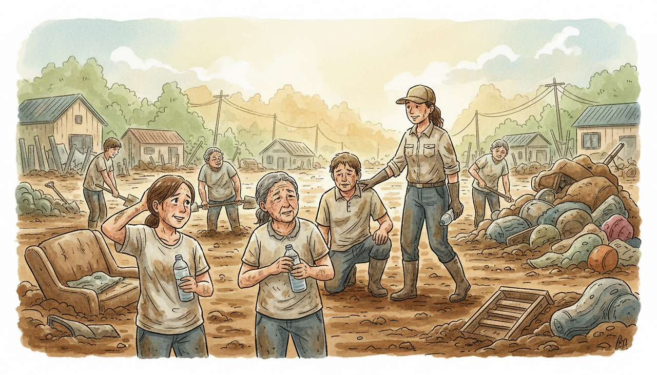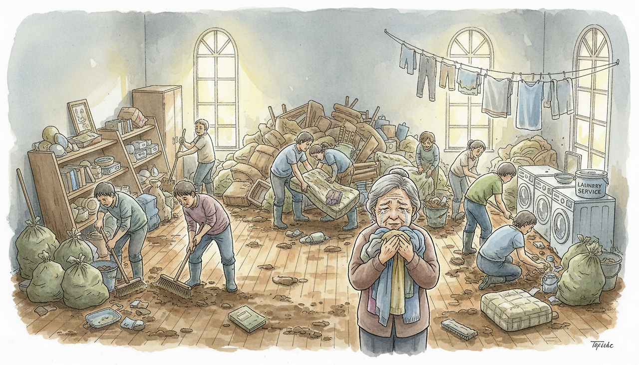 장갑을 끼고 삽을 들었다. 진흙을 퍼냈다. 망가진 가구를 끌어냈다. 쓸 수 있는 것과 버려야 하는 것을 나눴다. 말이 없었다. 지시도 필요 없었다. 각자 보이는 것을 했다. 볼수록 해야 할 일이 나왔다.