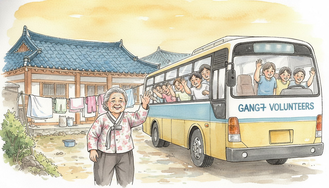 깨끗하게 빨아 넌 빨래가 마당에 가득 널려 있었다. 집 안도 한결 정돈되어 있었다. 할머니가 손을 흔드셨다. 봉사자들도 버스 창문을 열고 손을 내밀었다.