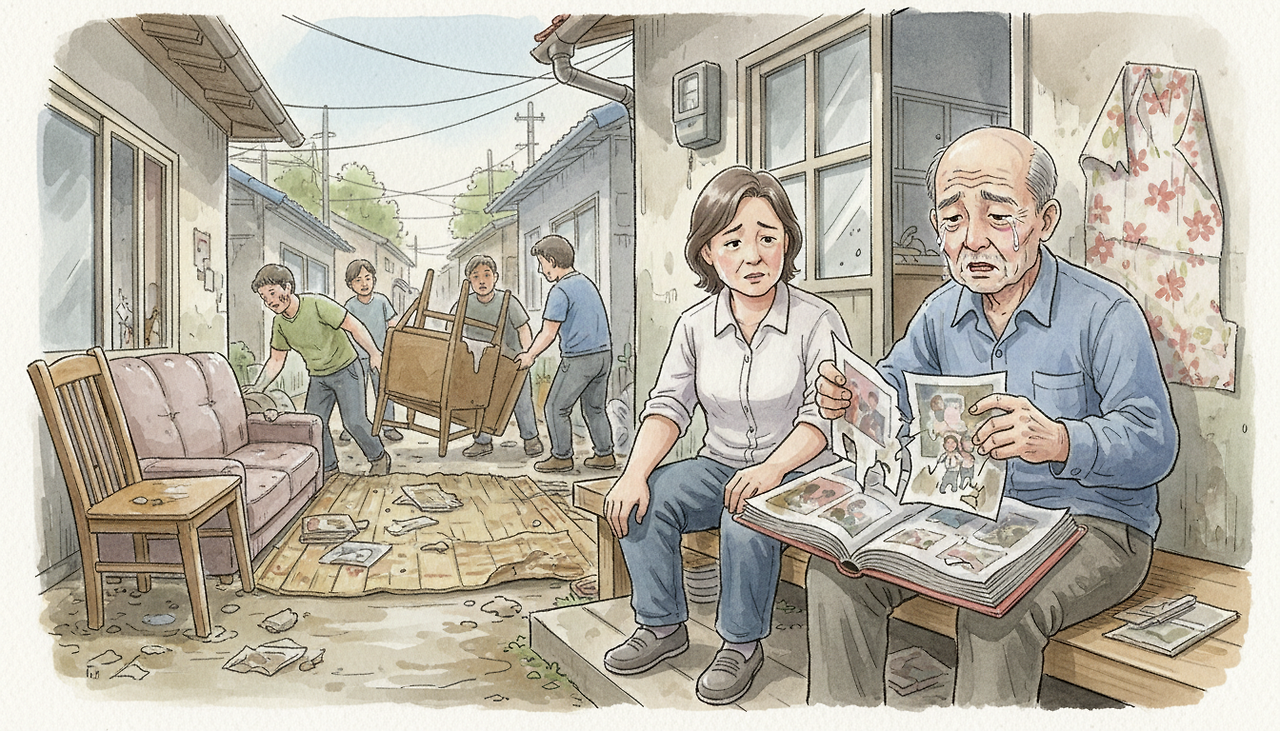 팔십 가까운 어르신이 마루에 앉아 계셨다. 수십 년 된 앨범이 물에 젖어 있었다. 사진들이 서로 붙어버린 것을 손으로 한 장씩 떼어내려다 찢어지자, 그 자리에서 무너지신 것이었다. 재산이 아니었다. 기억이 사라지는 것이었다.