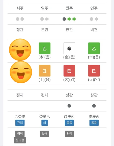 을목 일간이 월지 사화 상관을 두었다. 월지 상관은 일지 축토 편재를 생하고 일지 편재는 월간 신금 편관을 생한다. 상관생편재, 편재생편관을 이루어 사회적 생산활동에 필요한 식재관을 고루 활용 가능한 다재다능한 명조이다. 일간과 같은 비견 을목이 연간에 있지만,지지에 뿌리를 내리지 못 한 신약 명조이다. 신약 한 일간을 돕는 목 비견, 수 인성이 억부 용희신이다.