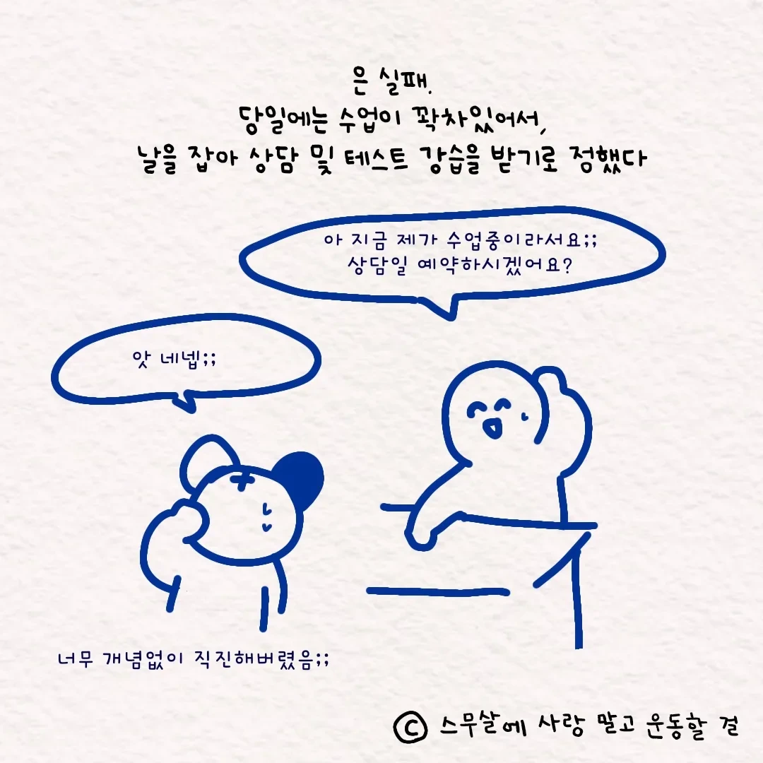 (지금 생각해보니, 예약 시간 맞춰서 딱딱 운영하는 PT샵이었는데, 수업 중에 불쑥 문을 두드린 나 때문에 선생님이 난처하셨을 것 같다. 다시 생각해봐도 민망쓰)