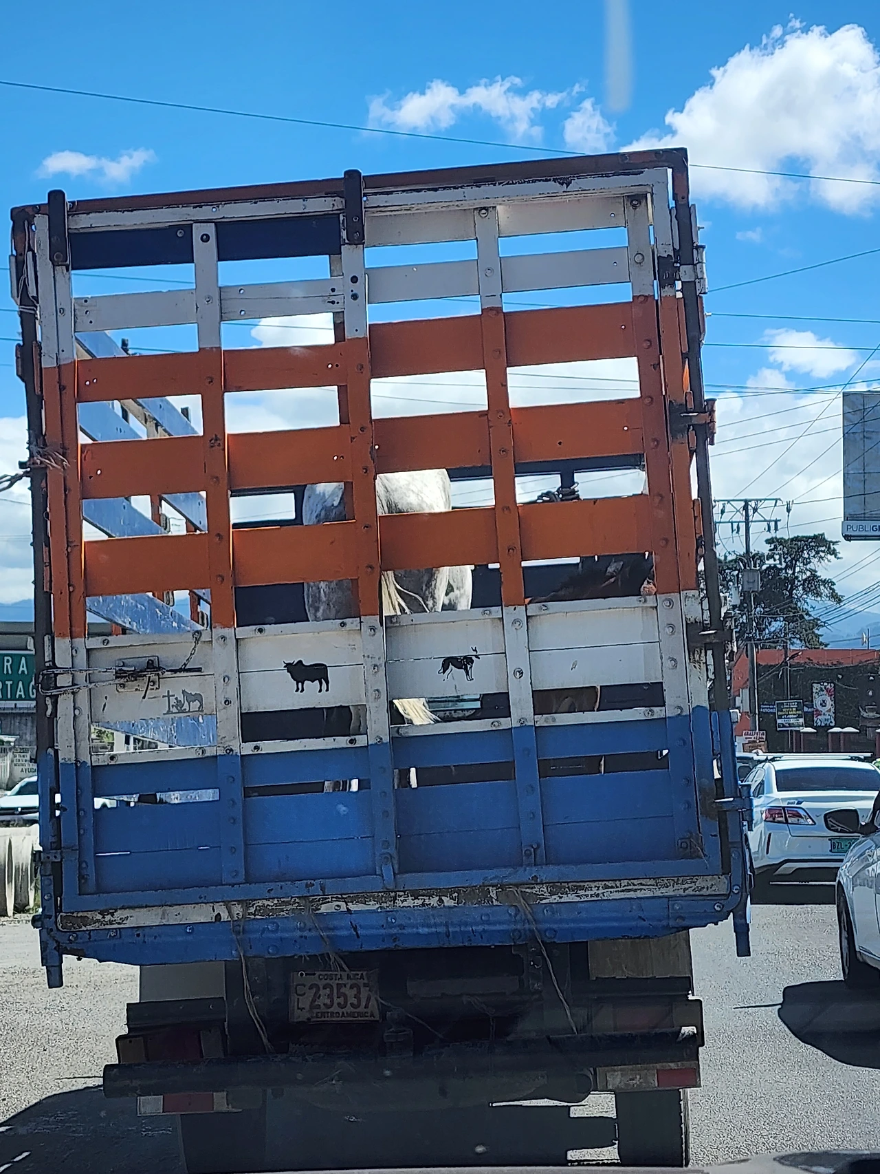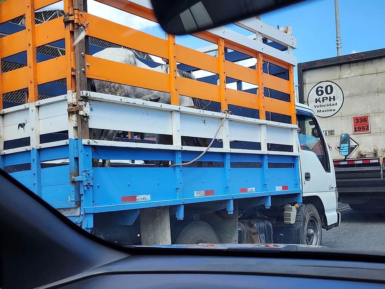 트럭에 엄마 말과 망아지가 타고 있는 걸 봤다.