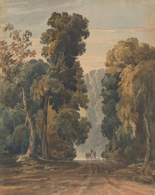 Horse, Cart and Driver on Wide, Tree-lined Lane