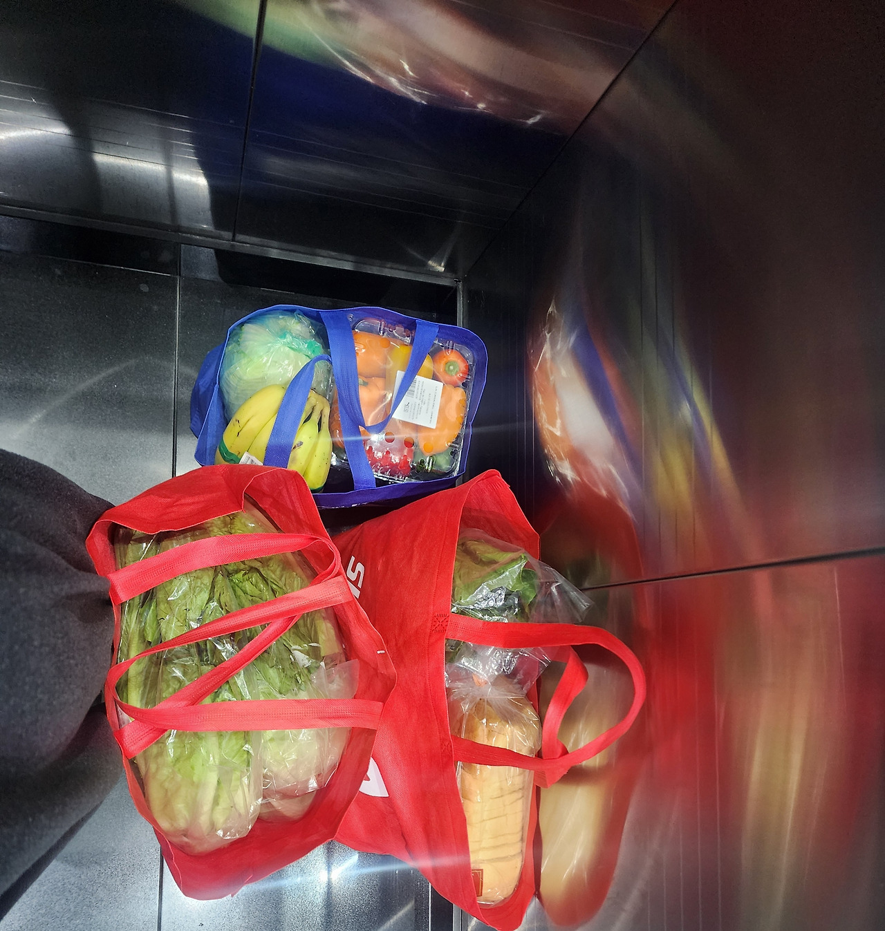 양상추 8통, 베이컨, 파스타면 4개, 양파 한 망, 바나나 한 송이, 멜론 한 개, 식빵 하나. 버섯 작은 팩 두 개 샀다.