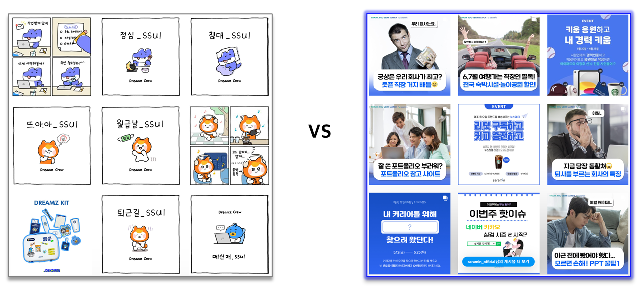 위의 이미지는 잡코리아와 사람인의 SNS 게시물이다. 어느쪽이 잡코리아일까? 바로 왼쪽이다. 게시물을 클릭하기 전에 구직자가 볼 수 있는 정보는 '점심, 월급날, 퇴근길'과 같은 간소한 단어들 뿐이다. 반대로 사람인은 '포트폴리오 참고 사이트', '모르면 손해인 PPT 꿀팁'과 같은 정보를 전달하기 위한 콘텐츠를 위주로 하고 있다. 단순히 MZ세대에 흥미를 유발할 수 있는 콘텐츠만이 답이 아니라는 것이다.