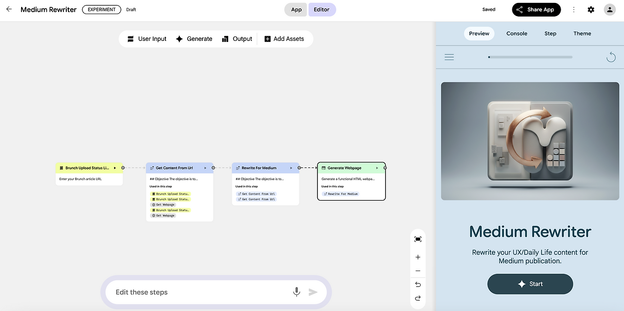 간단한 자연어와 비주얼 편집만으로도 각종 프롬프트, 모델, 도구가 하나로 연결된 강력한 AI 미니 앱을 만들고 공유능한 구글의 베타 서비스