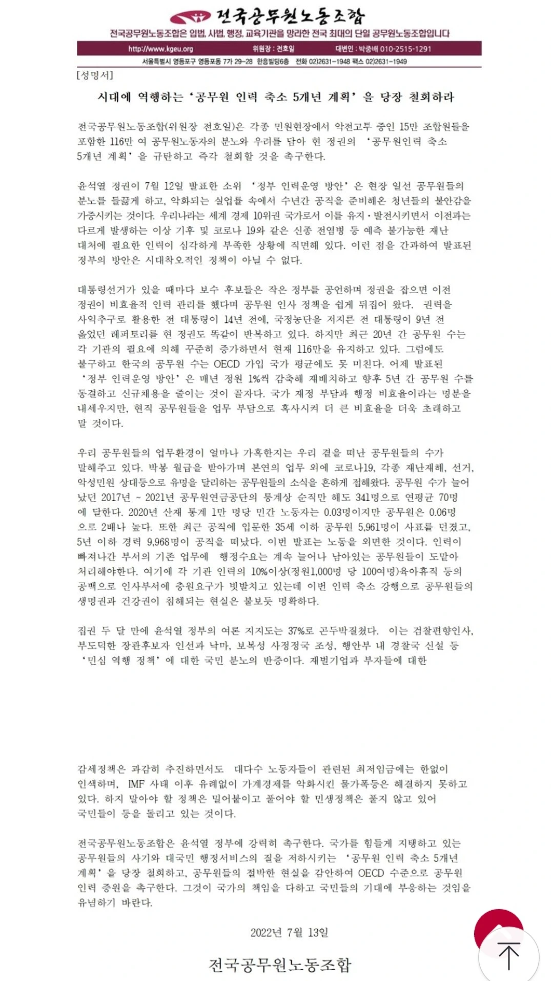 (출처: 전국공무원노조 2022. 7. 13일 규탄문)