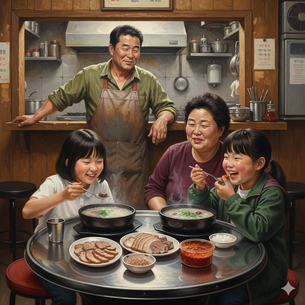 그 맛은 충격이었다. 그녀가 알던 깔끔한 세상과는 완전히 달랐다. 돼지 뼈의 고소하고 텁텁한 맛, 순대 특유의 묵직하고 비릿한 듯 진한 풍미, 그리고 들깻가루가 만들어 낸 구수한 흙내음까지. 그 모든 맛이 섞여 입안에서 거친 폭풍을 일으켰다.