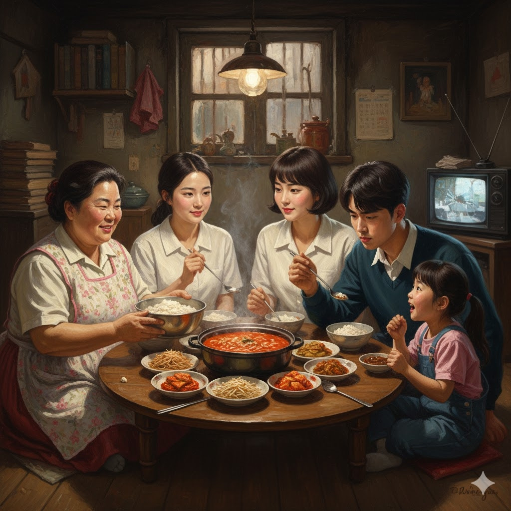 김치찌개와 조촐한 반찬 몇 가지가 차려진 상이 방 한가운데 놓였다. 좁은 방이지만, 영석, 정희, 수아와 이웃 곰소댁, 숙희까지 총 다섯 명이 옹기종기 모여 앉으니 발 디딜 틈 없이 꽉 찼다. 마치 친척들의 명절 식사처럼 북적이는 분위기였다.