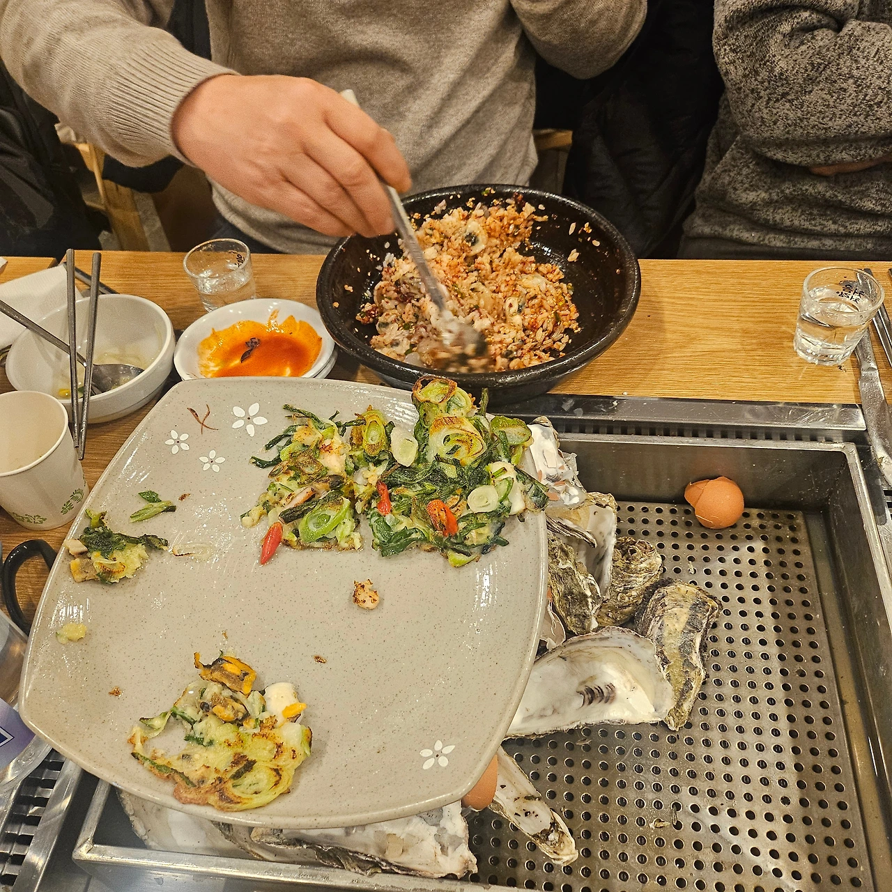 마스크를 쓰고 왔는데 굴찜 먹을 때마다 벗는다. 콧물이 줄줄 흐른다.