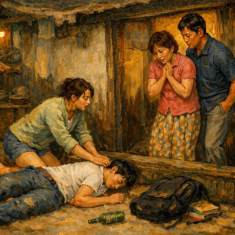 정희가 다급하게 영석의 어깨를 흔들었다. 영석은 초점 없는 눈을 간신히 뜨며 정희를 바라보았다. 그의 눈은 이미 눈물로 짓물러 있었다.