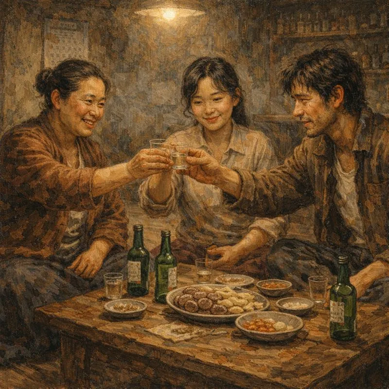 곰소댁은 좁은 방 한구석에 쟁반을 내려놓으며 영석과 정희에게 잔을 건넸다. 평소 술을 즐기지 않던 정희도 오늘만큼은 말없이 잔을 받았다. 맵싸한 소주가 목구멍을 타고 넘어가자, 곰소댁이 길게 한숨을 내쉬며 입을 열었다.