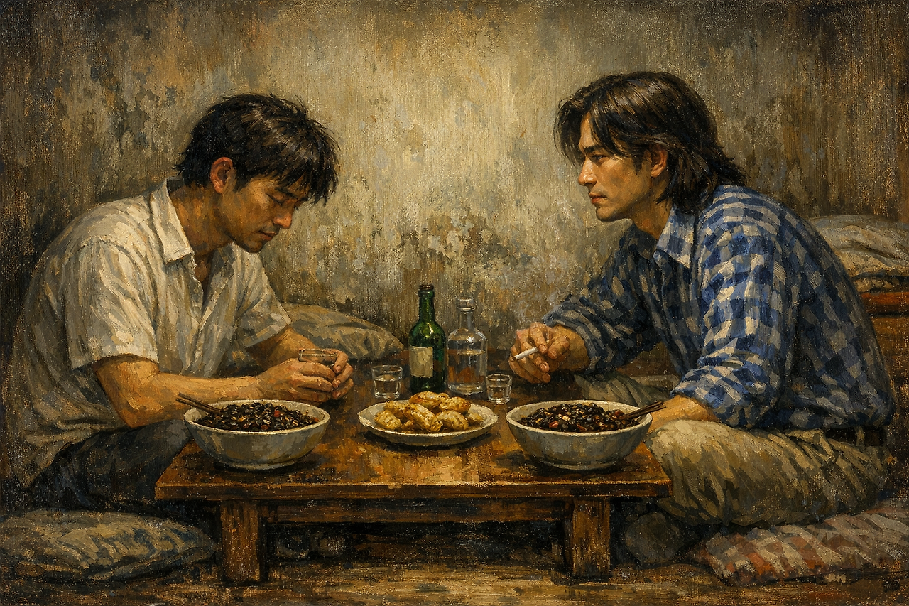 두 청년 사이로 독한 술 향기가 흩어졌다. 깐풍기의 붉은 양념이 마치 누군가의 핏자국처럼 번져 보였다. 영석은 목구멍이 꽉 막힌 듯 아무 말도 할 수 없었다.