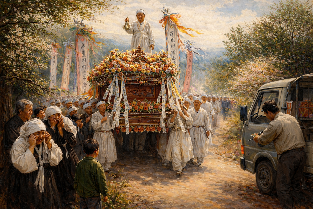 굴건제복한 사람들이 그 꽃가마 뒤를 잇고