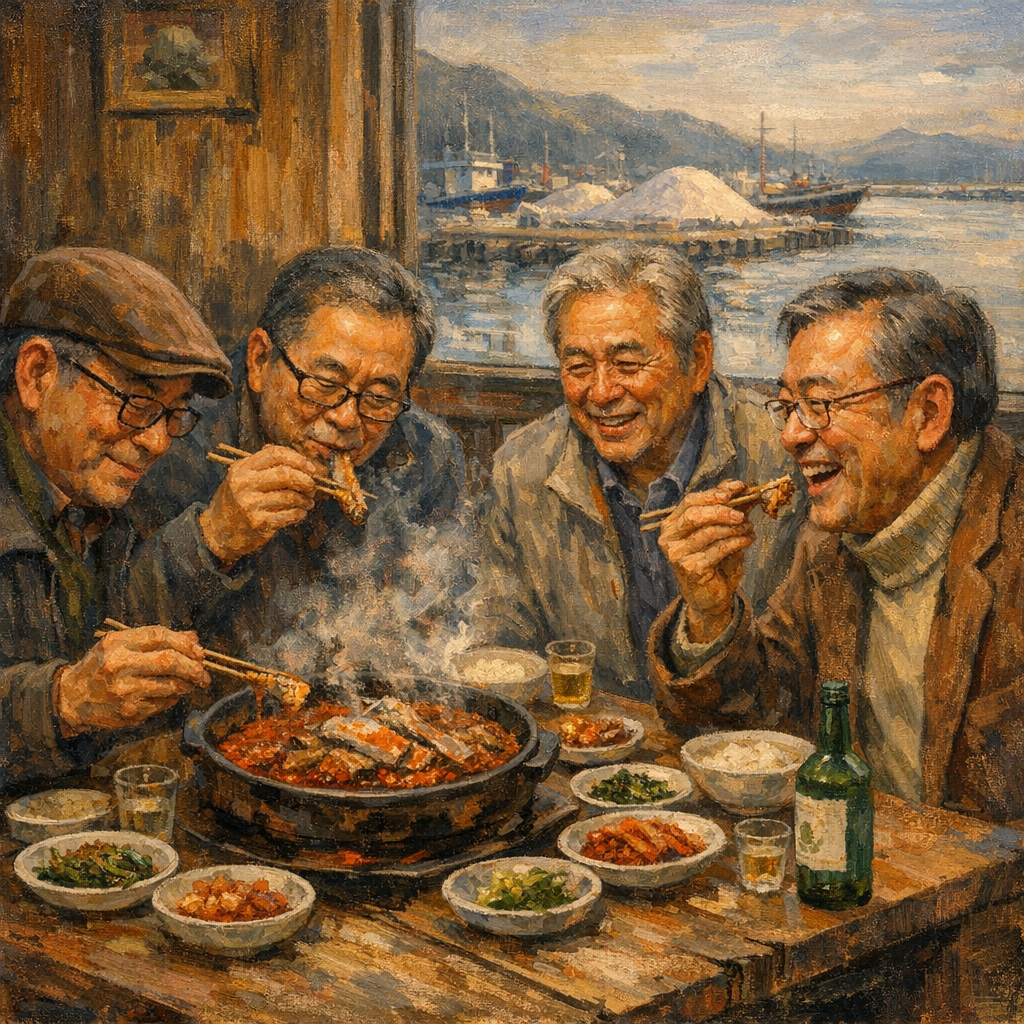 "간이 딱 맞어갖고 섯바닥 끝이 얼큰허니 개운한 것이, 참말로 오져부네, 엄니.