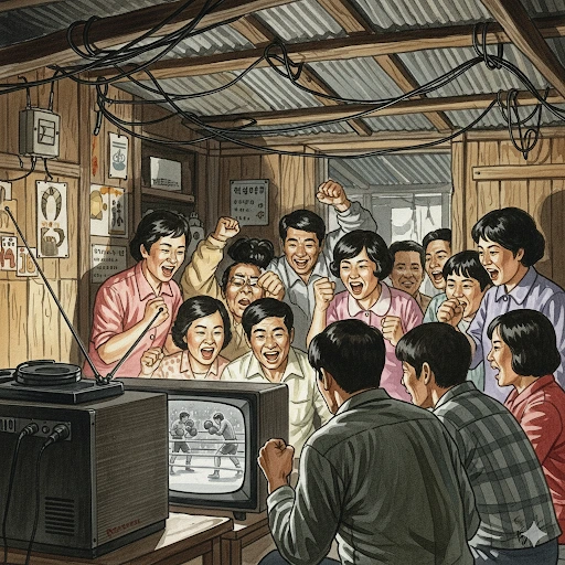 오후 6시쯤 누나는 아직 퇴근을 하지 않았는데 영석이네 집에 TV가 있다는 소문을 듣고 많은 사람이 모였다. 숙희 엄마는 감자를 삶아 소금과 함께 들고 왔다. 좁은 공간에 퀴퀴한 땀 냄새와 담배 냄새 등이 섞여 숨쉬기가 곤란했지만 모두 흥분한 상태였다.