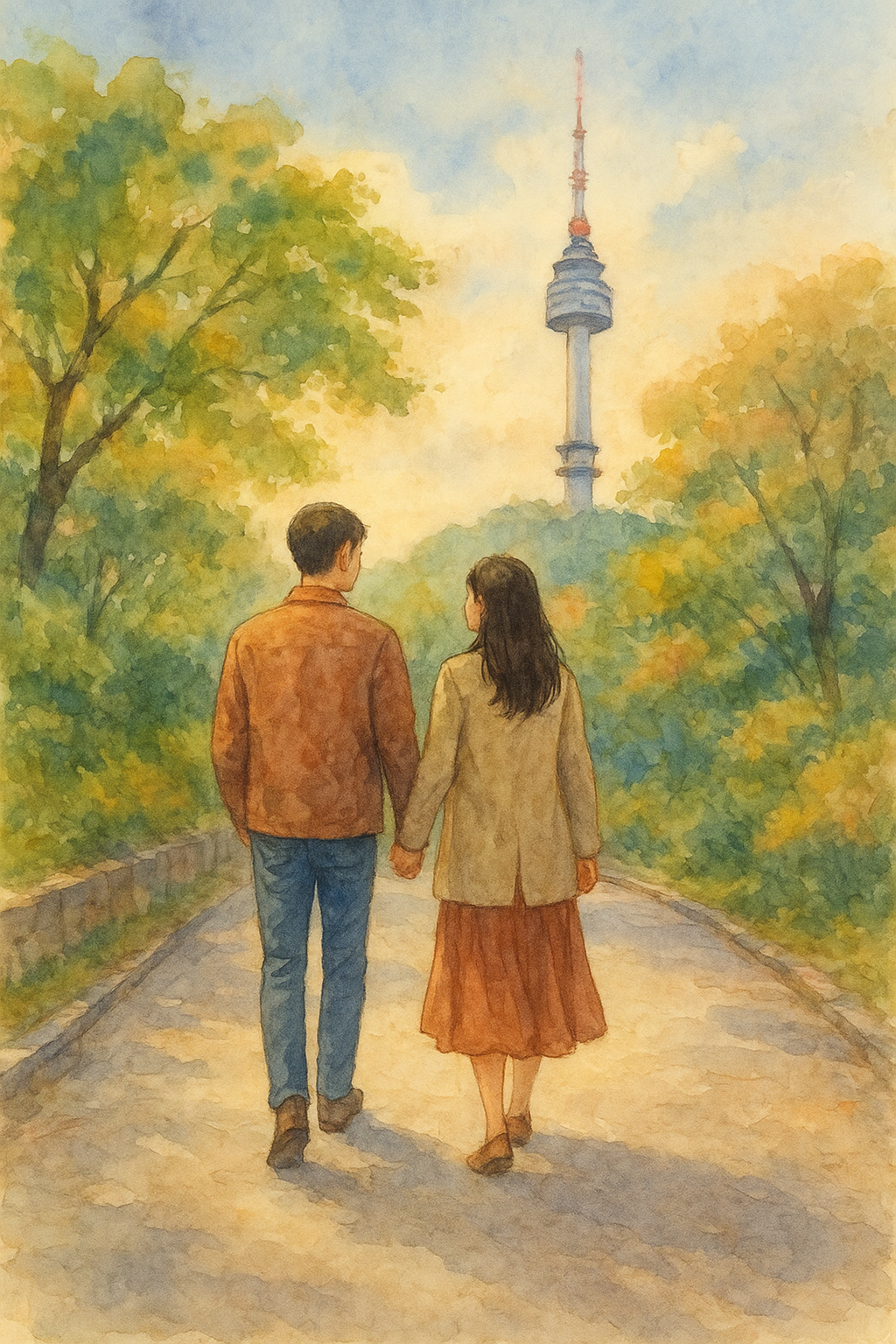늦은 오후의 아직 식지 않은 볕이 이태원의 거리를 비스듬히 비추고 있었다. 미군 부대에서 흘러나온 이국적인 팝송이 낡은 스피커를 통해 흘러나오고, 미군 병사들의 캐주얼한 옷차림과 검은 머리 한국 젊은이들의 청청 패션이 뒤섞인 거리는 활기로 가득했다. 수아의 단발머리가 바람에 살랑거렸다. 두 사람은 말없이 천천히 길을 걸었다. 길가에는 작은 구멍가게들이 드문드문 있었고, 그 앞 평상에는 동네 아주머니들이 앉아서, 부채질을 하며 이야기를 나누고 있었다. 오래된 가로등 아래를 지나갈 때마다 그림자가 길어졌다 짧아지기를 반복했다. 아스팔트 위로 뜨거운 열기가 아지랑이처럼 피어오르는 듯했다. 고개를 들어 올리자 남산의 푸른 숲이 시야에 들어왔다. 도시의 소음은 점차 멀어지고, 매미 소리가 귓가를 채우기 시작했다.