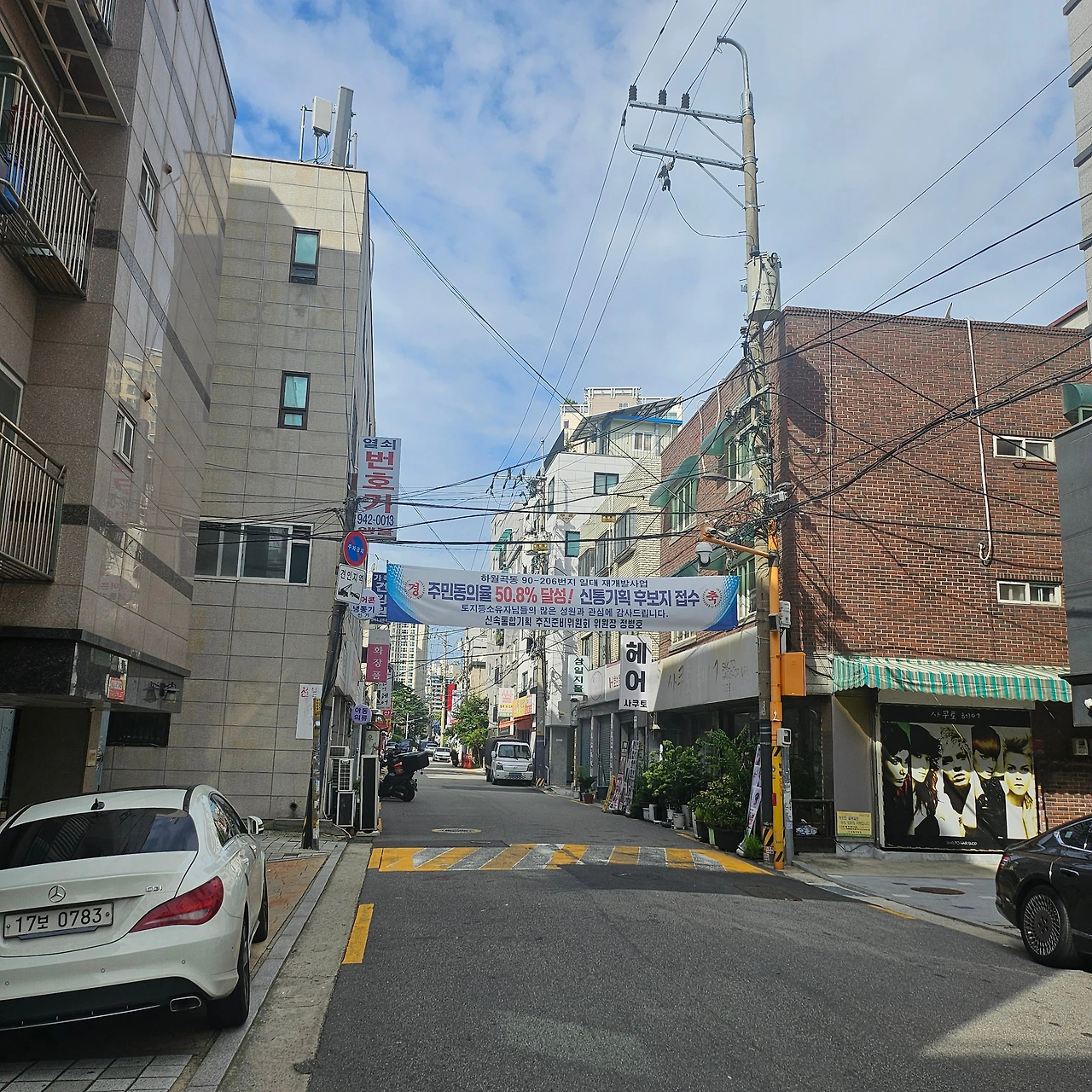 골목길에 '주민동의율 50.8% 달성! 신통 재개발 후보지 접수'라는 플래카드가 걸렸다