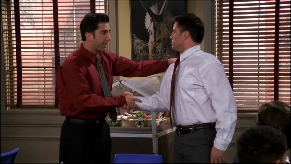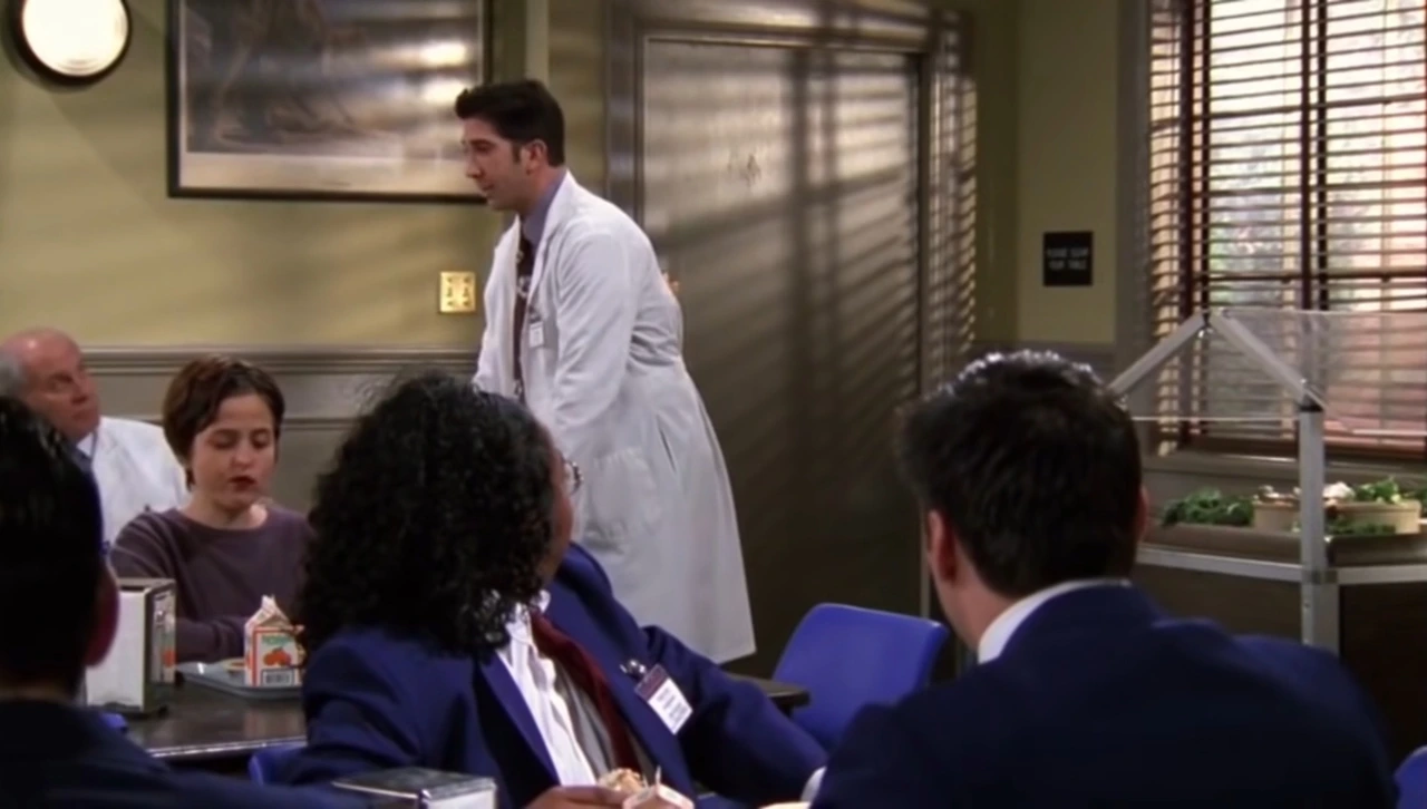 Ross : (다른 과학자들에게) 저는 오늘 점심을 이 테이블에서 먹을 겁니다. 조이만 괜찮다면 이 중간 테이블에서 제 절친 조이와 함께요.