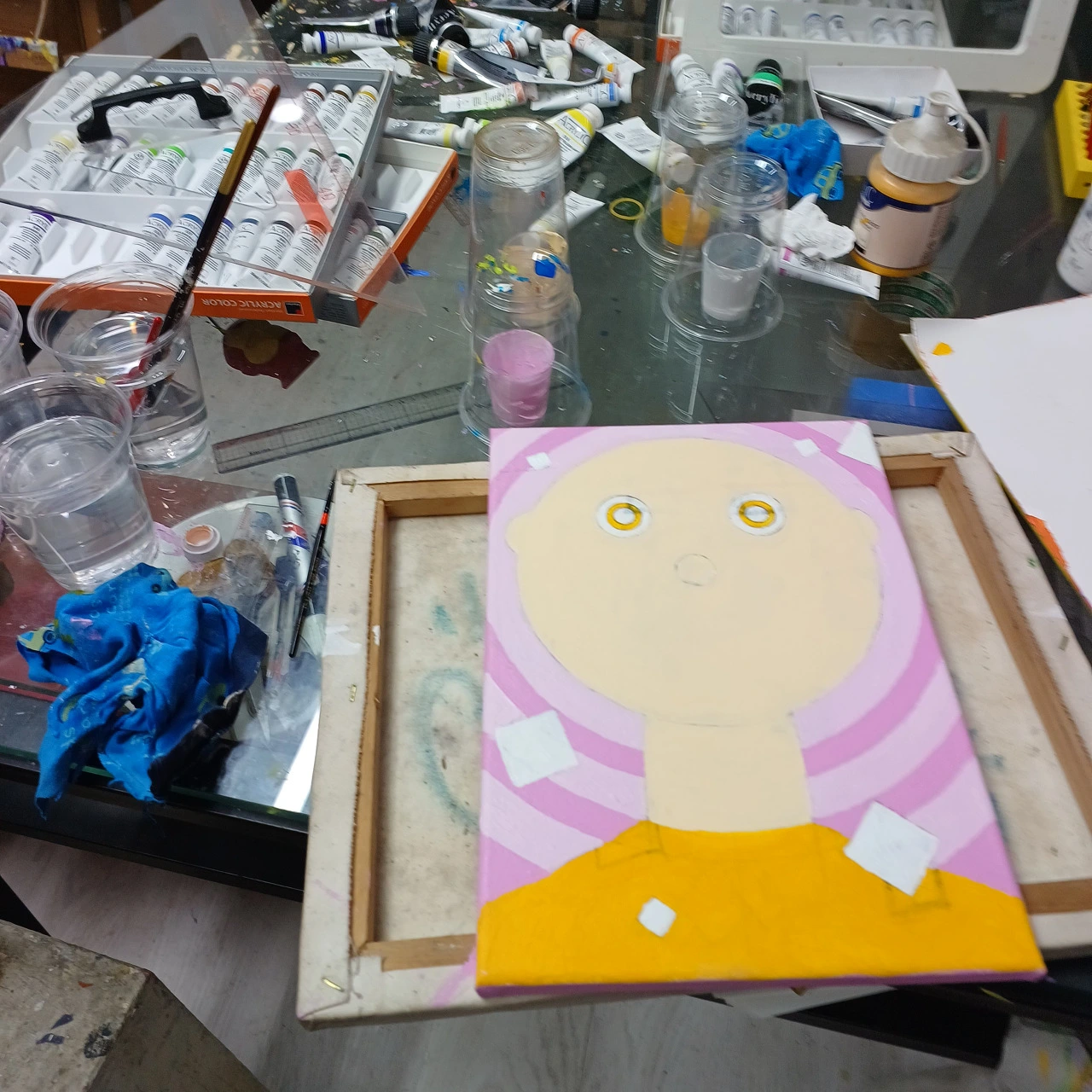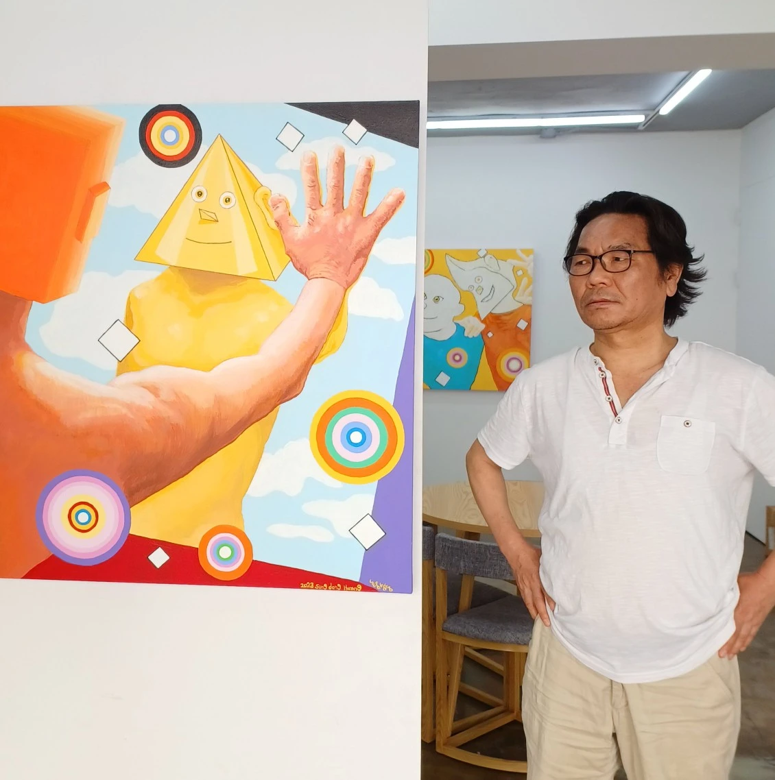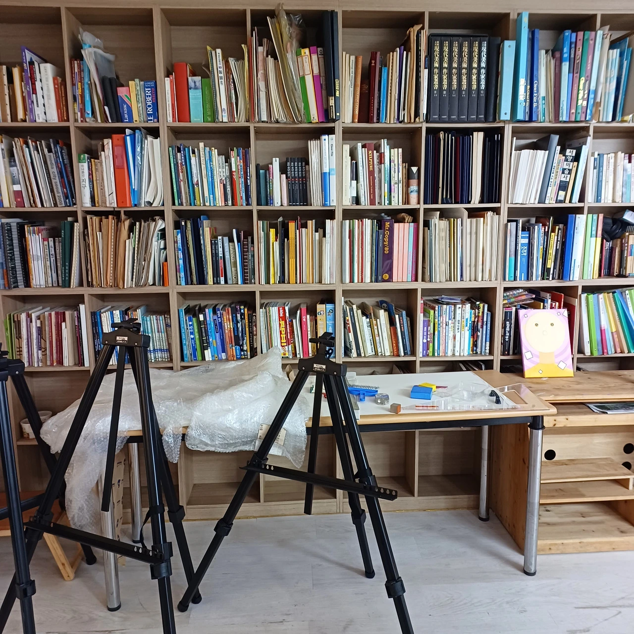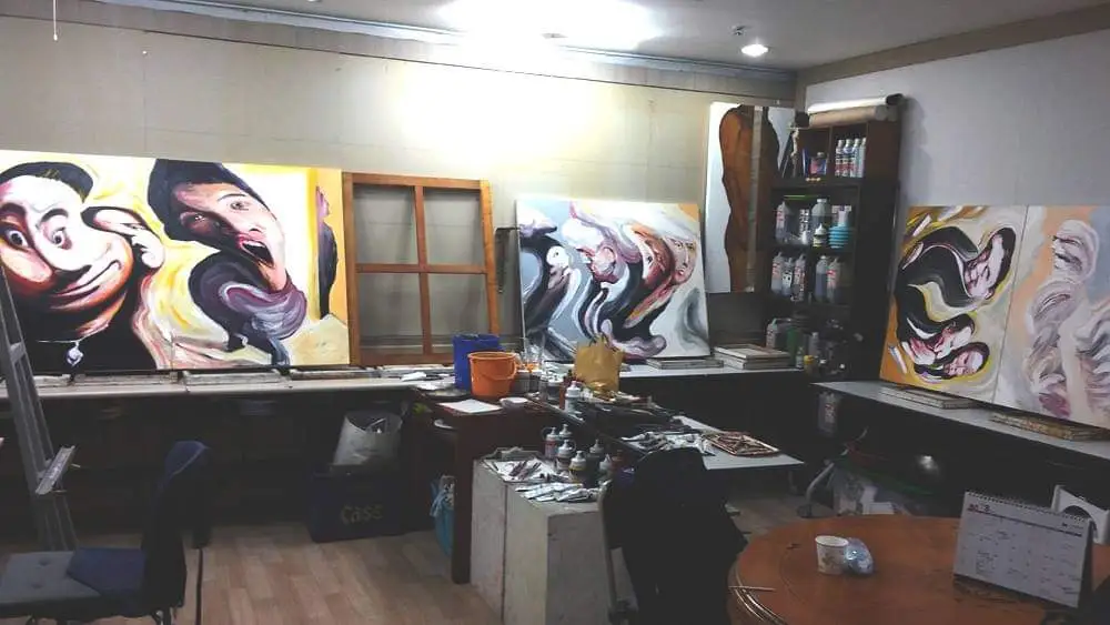 배경의 작업실도 지금은 새로 인테리어를 했고 뒤에 보이는 작품들도 작년 명퇴 이후에야 모두
