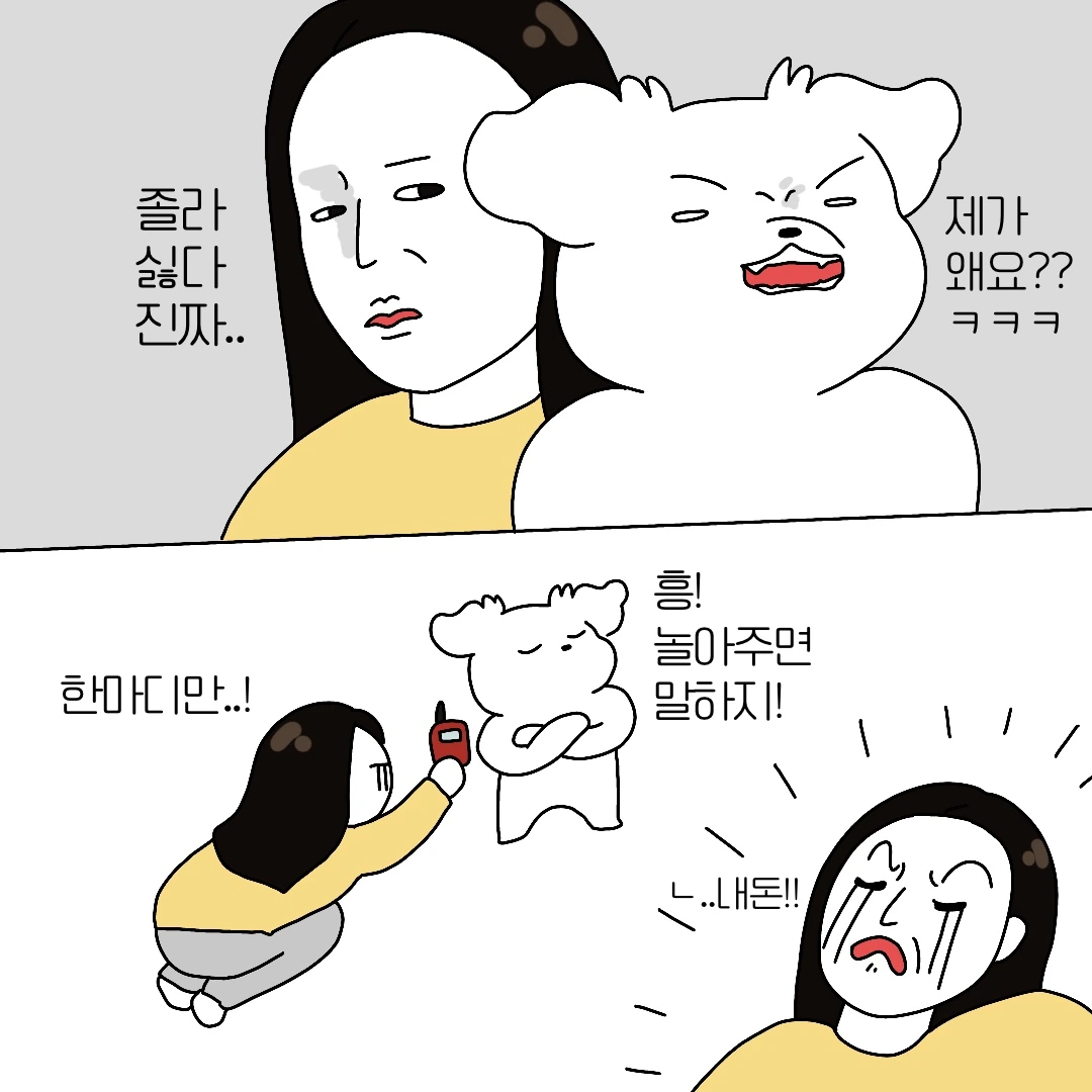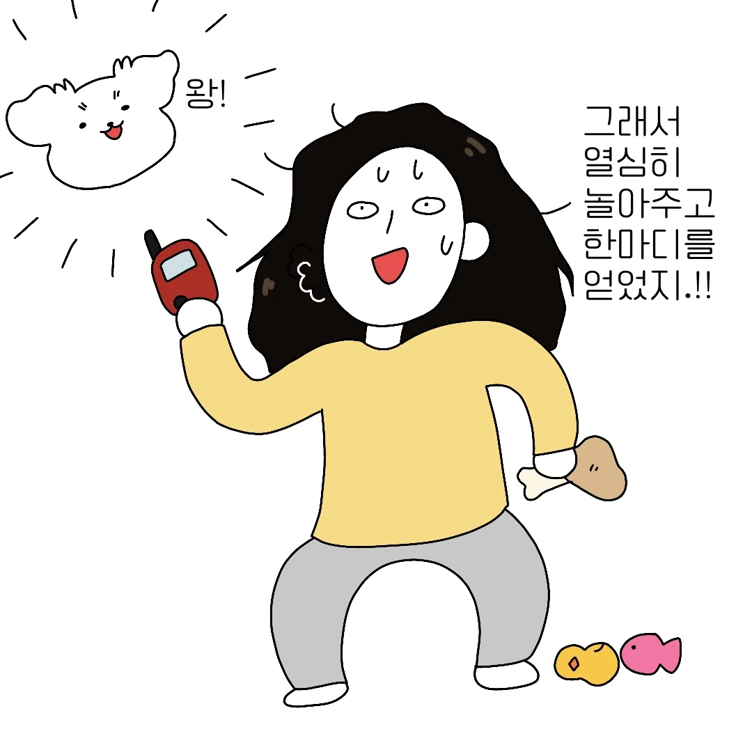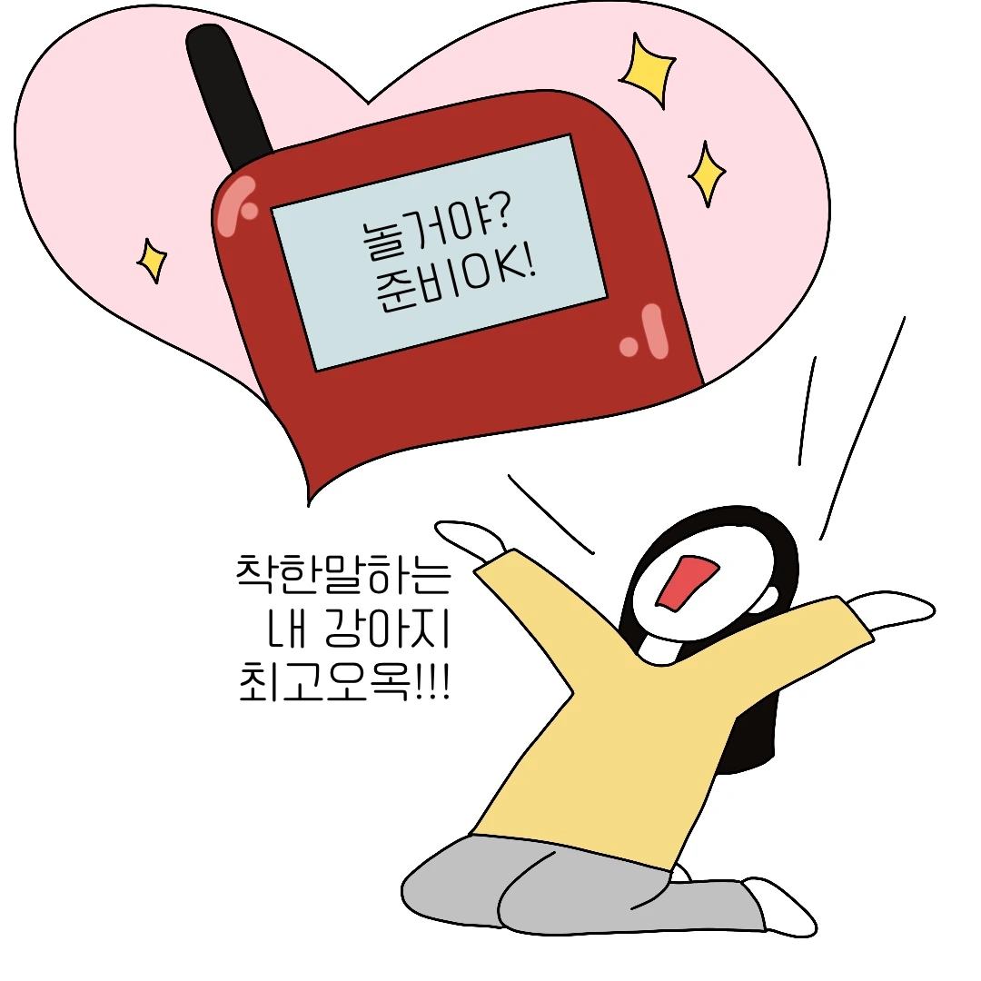 우리 집 귀여운 강아지의 마음을 알고 싶어서 강아지 번역기를 샀다. 바로 써보려고 했으나 갑자기 과묵해진 나의 강아지... 그의 닫힌 입을 열기 위해 온갖 장난감들로 놀아줬고 마침내 첫 한마디를 번역할 수 있었다. 첫 번역은 '놀 거야? 준비 OK!' 난 정말 감동했다. 이 번역기 진짜 번역해주는 것 같아..!