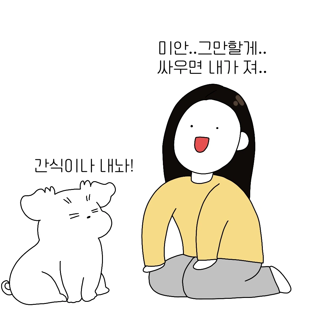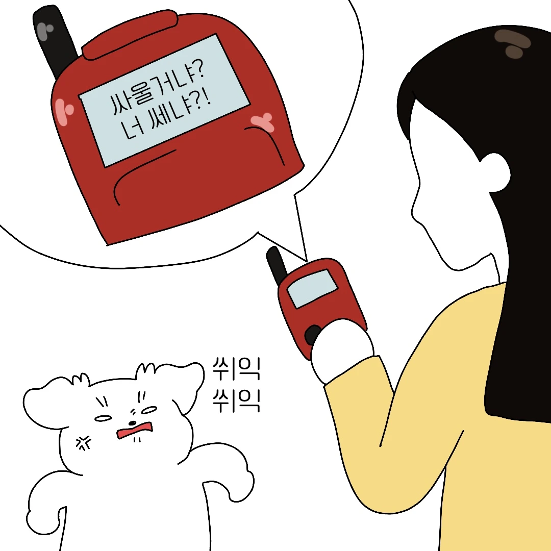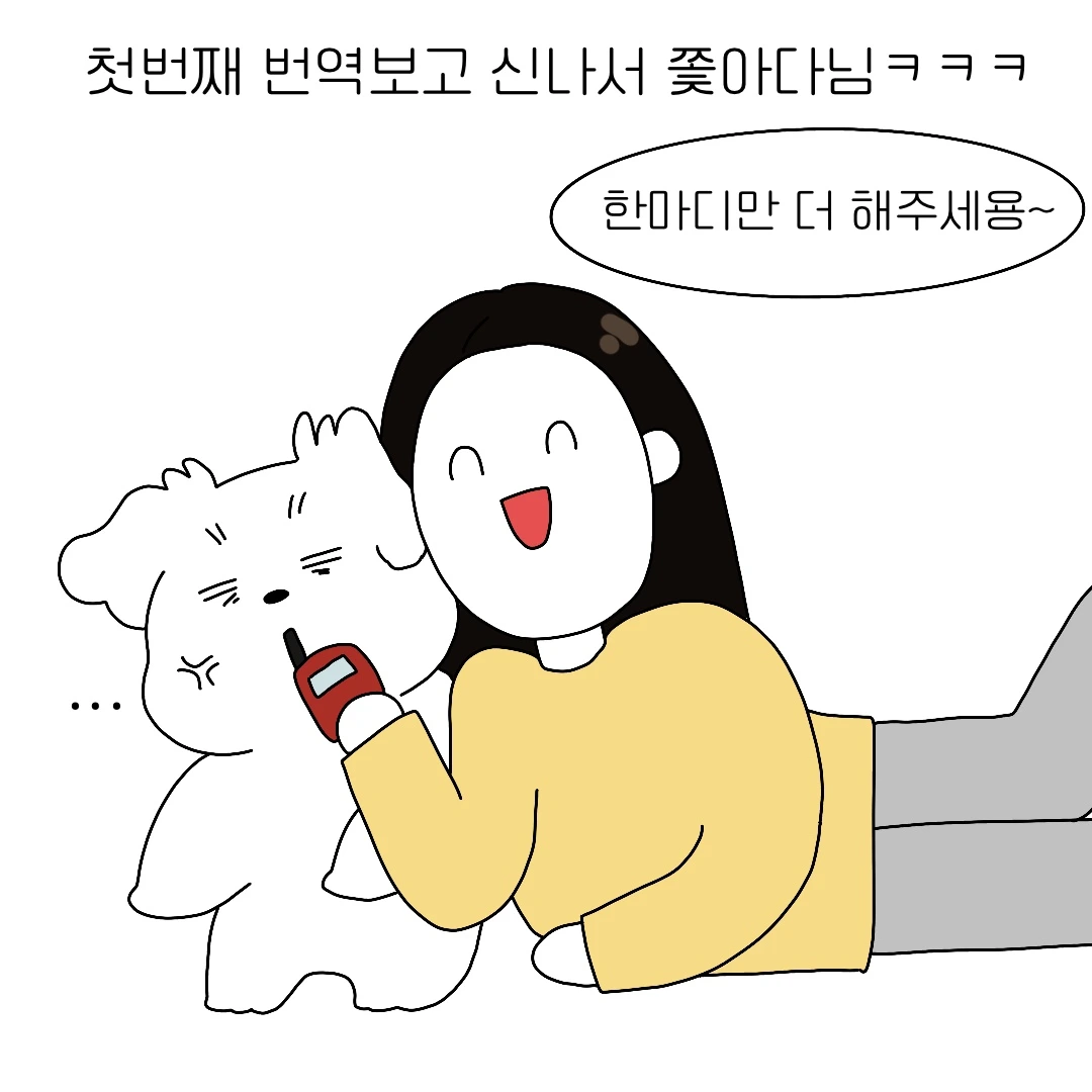 그래서 강아지에게 계속 붙어있었고 결국 그는 분노했다. 그의 분노의 목소리를 번역한 결과는 '싸울 거냐? 너 세냐!'였다. 정말 웃겨 이 번역기 뭔가 신빙성이 있었다. 화난 강아지는 간식을 먹으며 화를 풀었고 나는 번역할 때 찍은 사진을 보며 행복했다.작은 번역기 하나로도 행복해지는 시간이었다.