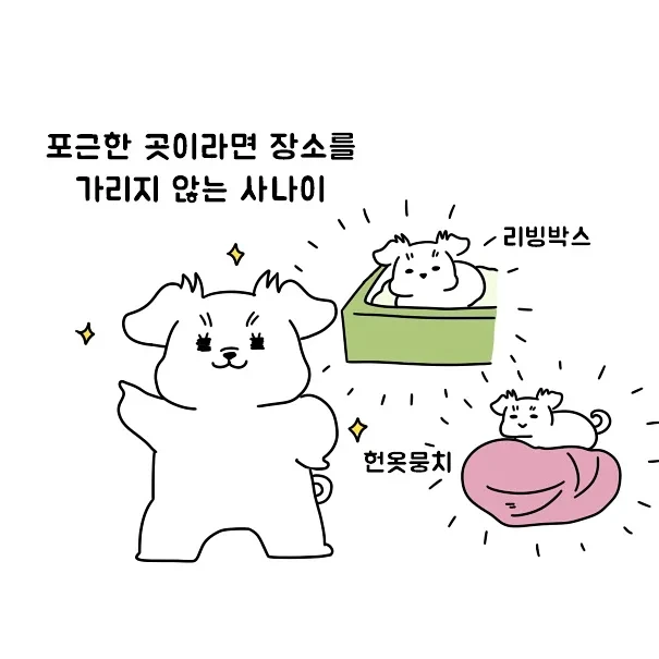 푹신한 곳이라면 그 어디든 가리지 않고 자리를 잡아서 옷을 정리할 때나 이불을 개기 전 주시하고 있어야 한다. 잠깐 방심하면 강아지에게 빼앗기게 되어 강아지의 수면이 끝나야 정리할 수 있기 때문이다.