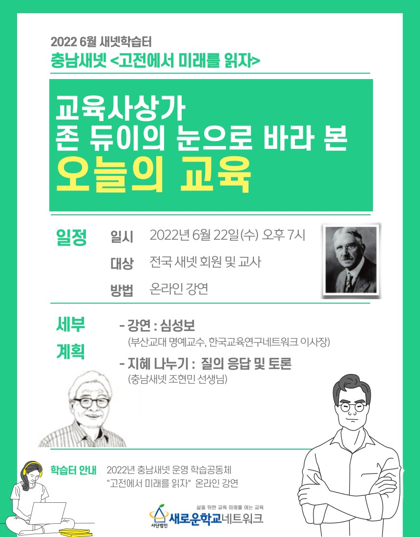 새로운 학교를 만들고자 하는 우리 새넷 회원들은 어떤 질문을 품고, 무엇을 실천해야 할까. 외부의 부당한 비판이나 저평가에는 맞서야 하겠으나, 교육청 정책에 너무 기댔던 것은 아닌지 스스로 돌아보아야 하지 않을까. 듀이의 비판을 거울삼아 새로운 교육의 이념, 내용과 방법적 원리가 정립된 것인지, 그랬다면 제대로 작동하고 있는지 돌아보아야 하지 않을까. 새 대통령과 새 교육감을 맞이한 6월 22일, 새넷 학습터에서 듀이를 만났다. 무언가 의미심장하다.