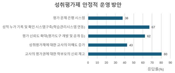 설문 결과는 교사들이 성취평가제 정착을 위해 평가 공정성과 신뢰 확보, 업무 부담 경감이라는 두 축에서 실질적인 지원을 요구하고 있음을 보여준다. 특히 학부모와 학생이 성취도 평가 결과를 신뢰할 수 있는 구조가 마련되어야 절대평가 체제가 안정적으로 정착될 수 있을 것이다.