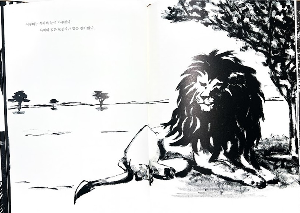 프랑스 작가 티에리 드되의 「야쿠바와 사자」는 매년 빠지지 않고 읽어주는 책이다. 캔버스에 검정색 아크릴 물감을 묻힌 붓으로 그려낸 강렬한 흑백 그림이 전체적인 분위기를 압도한다.