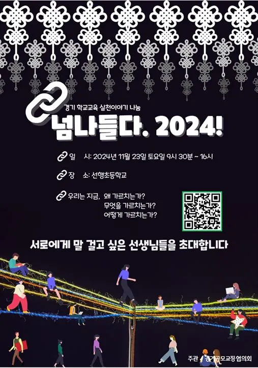 그러나 한 명의 교사는 힘이 없다. 그건 이미 혁신학교를 통해 익히 경험한 터, 뿔뿔이 흩어져 있는 일꾼들을 엮어 서로 머리를 맞대고 고민하고 만들어 나가는, 힘들지만 재밌고 가치 있는 경험을 만들어 내고 싶었다. 우리 학교 안뿐 아니라 각각의 학교에서 고군분투하고 있는 이들이 그저 각자의 자리에서 살아내고 있는 얘기들을 한자리에 모여 풀어내기만 해도 좋을 것 같았다. 그걸 우리가 해볼 수 있을까. 경기 공모 교장들이 모이면 늘 머리를 맞대고 고민하는 지점이었다. 멍석이라도 깔아보자는 심정으로 2023년 공모 교장들이 자발적으로 필요한 경비를 각출하여 일단 일을 벌여보자고 도전했고, 11월 25일 선행초에서 열린 『2023 경기 학교교육 실천이야기 나눔 - 다시, 넘나들다』라는 교육활동 나눔의 자리가 첫 시작이었다. 공모교장 학교 소속의 선생님들이 대부분이었지만 토요일임에도 불구하고 찾아온 100명이 넘는 선생님들의 열정과 그날의 뜨거웠던 분위기는 가히 놀라울 따름이었다. 5시가 넘어도 자리를 뜨지 않을 만큼, 혁신학교가 뭔지는 몰라도 같이 해볼 수 있을 것 같은 마음으로 들떠 있었던 그때와 오버랩되는 시간이었다.