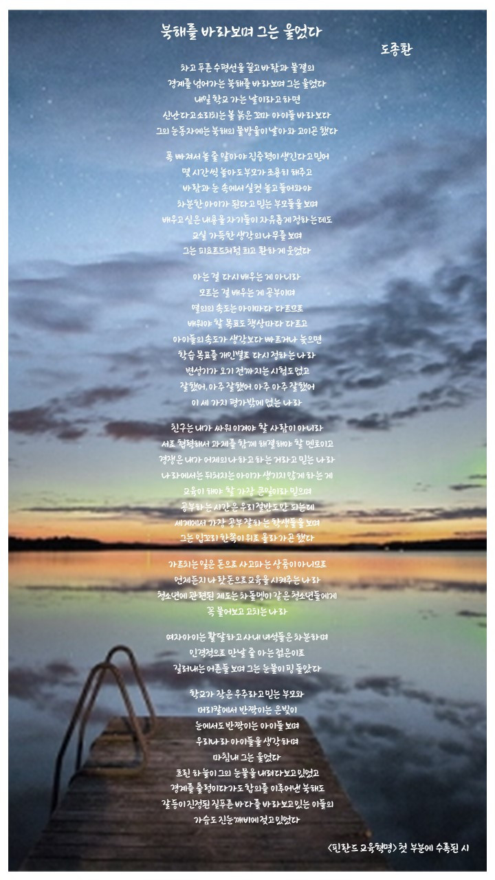 이번 봄부터 여름까지 우리 교육의 중요한 세 가지 갈림길을 거쳐왔습니다. 3월 9일 제20대 대통령 선거, 6월 1일 전국동시지방선거, 7월 21일 국가교육위원회 출범의 시간을 건너면서 승자는 모든 것을 가져갔고, 교육감 선거에서 소위 진보와 보수의 대결이 이루어졌습니다. 기대했던 국가교육위원회도 출범이 정상적으로 이루어지지 못했습니다. 그것보다 점점 표현도 거칠어지고 상대를 향해 갈등을 일부러 표면화시키는 말과 행위를 바라보면서 정말 다정한 것이 살아남을까? 의구심이 들 수밖에 없습니다.