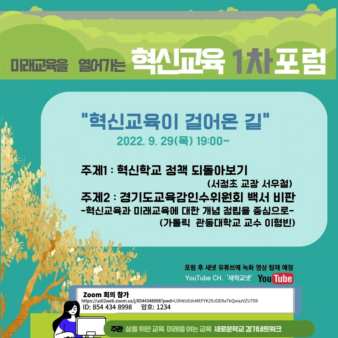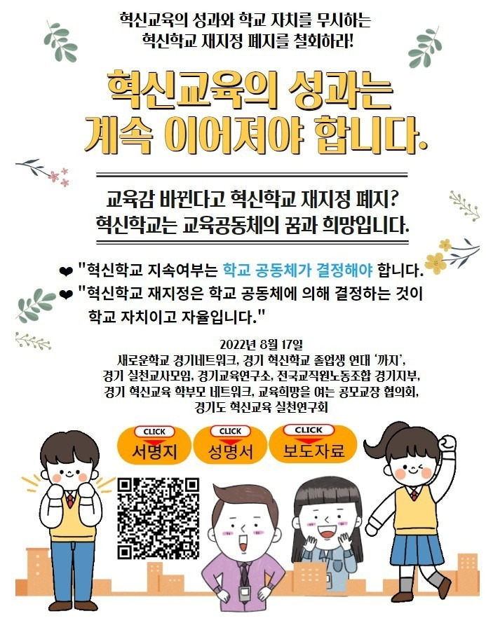 ‘혁신학교는 경기교육이 만든 소중한 학교 개혁의 산물이고 기준이었습니다. 경기교육 교원들이 긴 시간을 고민하면서 연구하고 실천해 온 과정이자 결과물이었으며 공교육 학교를 근본적으로 개혁하려 했던 우수한 사례입니다. 그러나, 자의든, 타의든 13년간 이어온 혁신학교가 새로운 길에 들어서게 되었습니다. 그동안 우리가 학교 현장에서 쏟았던 혁신 교육이 어떻게 변화 발전되어야 하는지 학교 현장의 힘으로 판단하고 나아가야 할 때라고 생각합니다(이하 생략).’