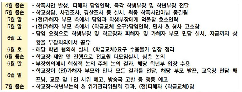 사안을 인지하고 논의하는 단위가 담임에서 학년 부장과 학생부장, 그리고 학교장과 부장 회의, 마지막엔 교원 다모임까지 동원되고 있으며, 민감하고 껄끄러운 학부모와의 각종 상담(잦은 전화, 대면 상담, 피해자-가해자 학부모 대면 등)은 학생부장과 학교장이 거의 도맡아 진행해주면서 담임교사의 부담을 많이 덜어주었다는 점이 중요했다고 생각합니다.