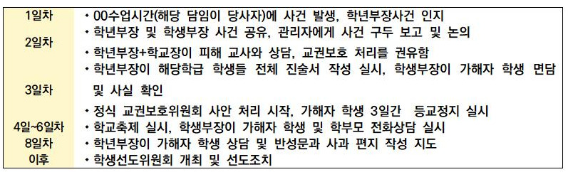 사안 진행 과정 내용을 보시면, 교권 사안 발생 후 즉시 학교장이 해당 교사에게 교권보호 요청을 권하였고, 또한 폭력을 행사한 해당 학생이 학교축제(다음날부터 시작되는 3일간의 축제행사) 기간 동안 다른 학생들에게 위협이 될 수 있다는 학년부장의 우려를 학생부장과 학교장이 적극적으로 받아들여 3일간의 등교정지라는 선조치를 시행할 수 있었습니다. 물론 처음엔 학부모와 학생의 반발이 있었지만, 학생부장과 학교장이 각각 학생과 학부모와 직접 상담하면서 받아들이게 해주셨습니다.