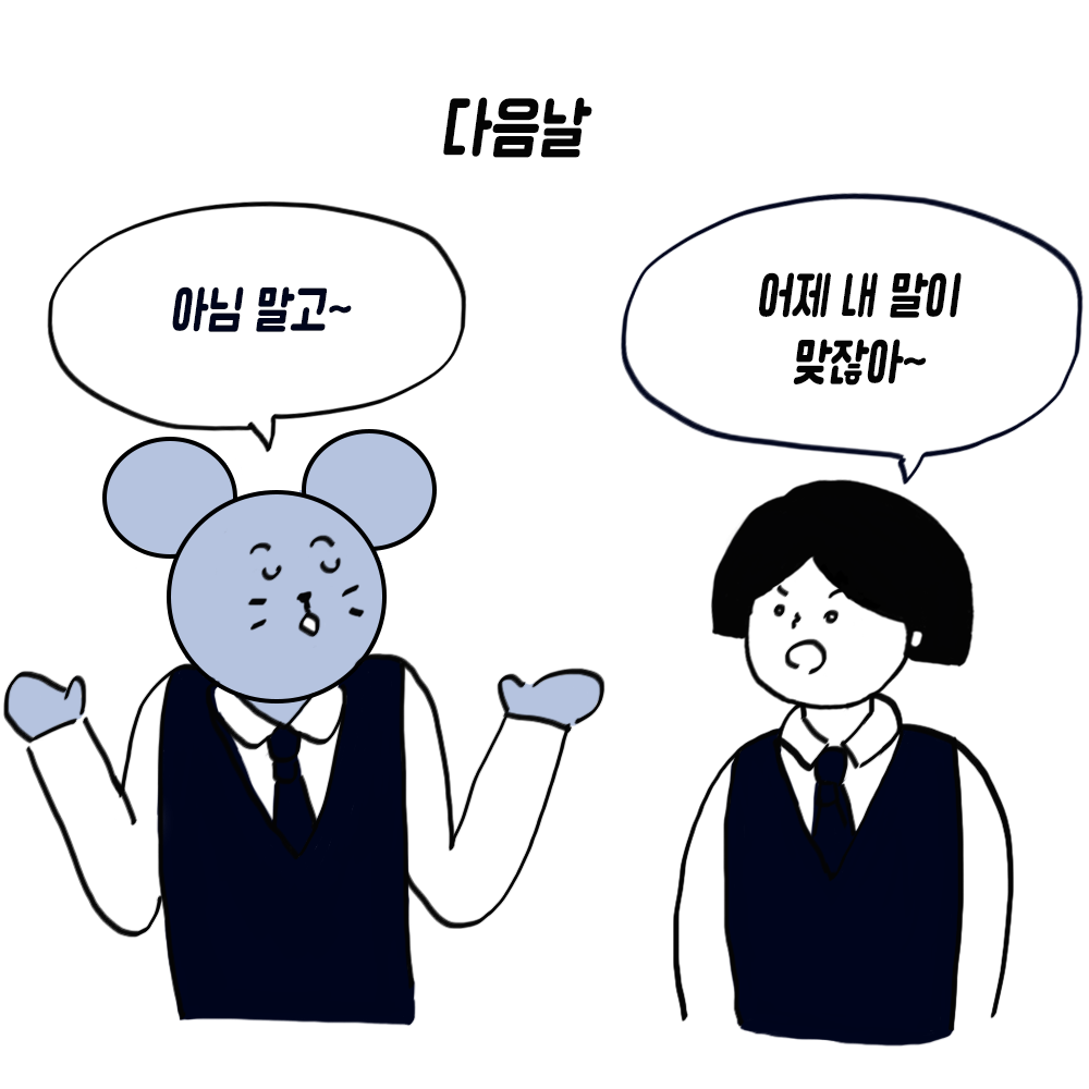 그녀가 '아님 말고'라고 말할 때마다 나는 속으로 '그러시겠지~'라고 속으로 생각하곤 바로 말을 흘려듣기 시작했다. 그리고 책임감 없는 말은 신뢰를 잃게 된다는 것을 배웠다.