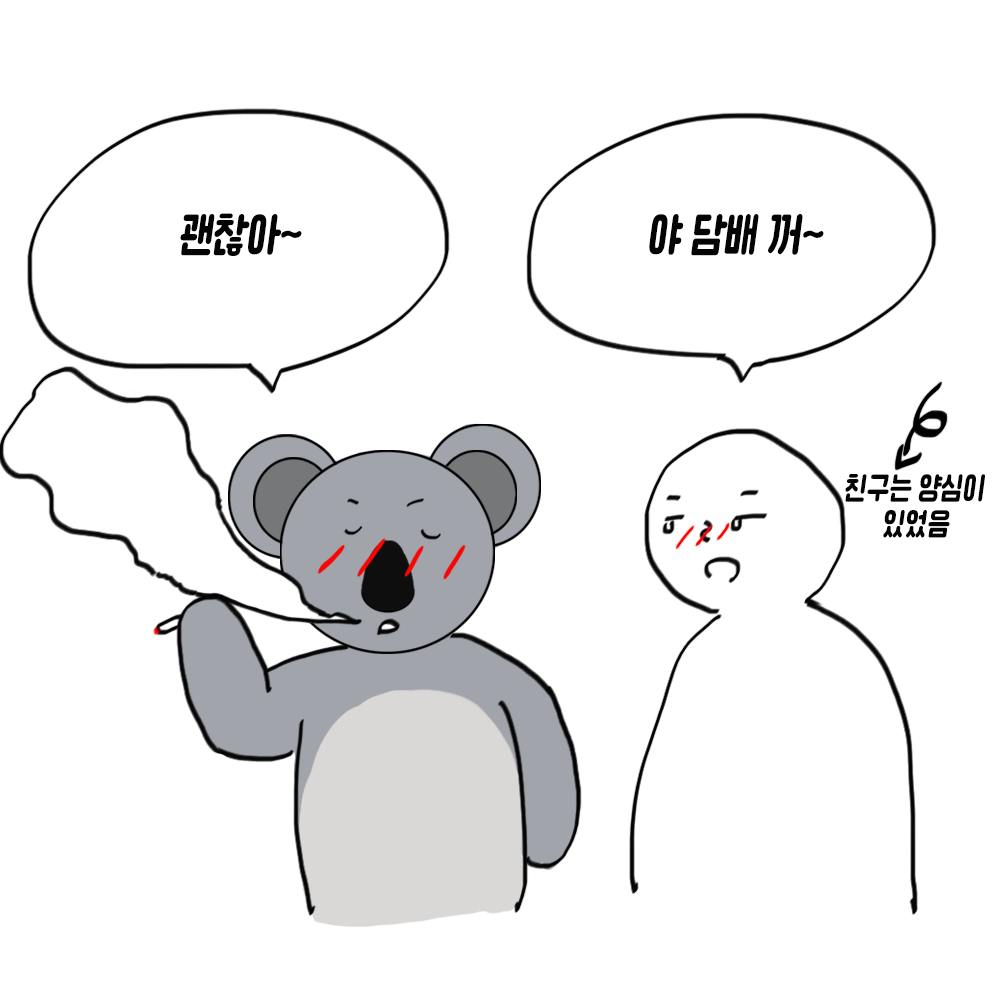 친구는 무언의 압박을 받은 듯 한 번 더 "새꺄, 마스크 잘 써~"라며 주의를 주자 담배 빌런 은 친구 말을 귓등으로 듣는지 다른 곳을 보며 "괜찮아~"라고 대답했다.