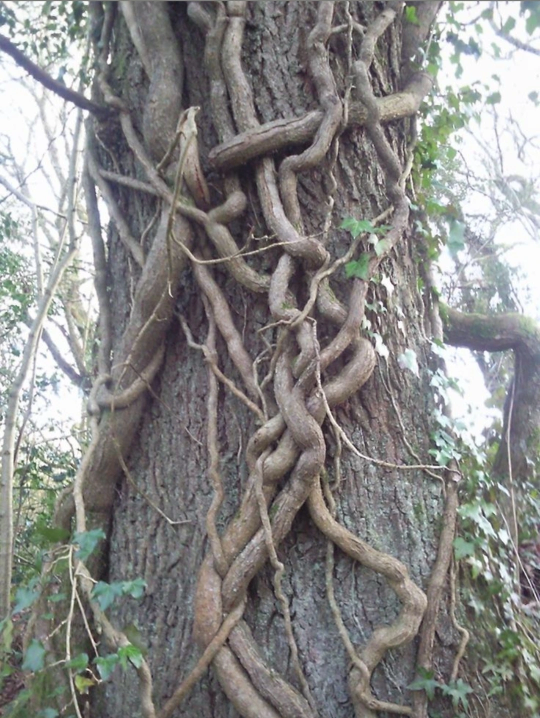 그 모습은 마치 땅속 깊은 어둠에서 뿌리 내린 고독한 욕망이 빛을 향해 고통스럽게 몸부림치는 듯했다. 덩굴은 단순히 기대어 오르는 것이 아니라, 그 나무 자체가 되어 버리려하는 절박한 몸짓으로 보였다.