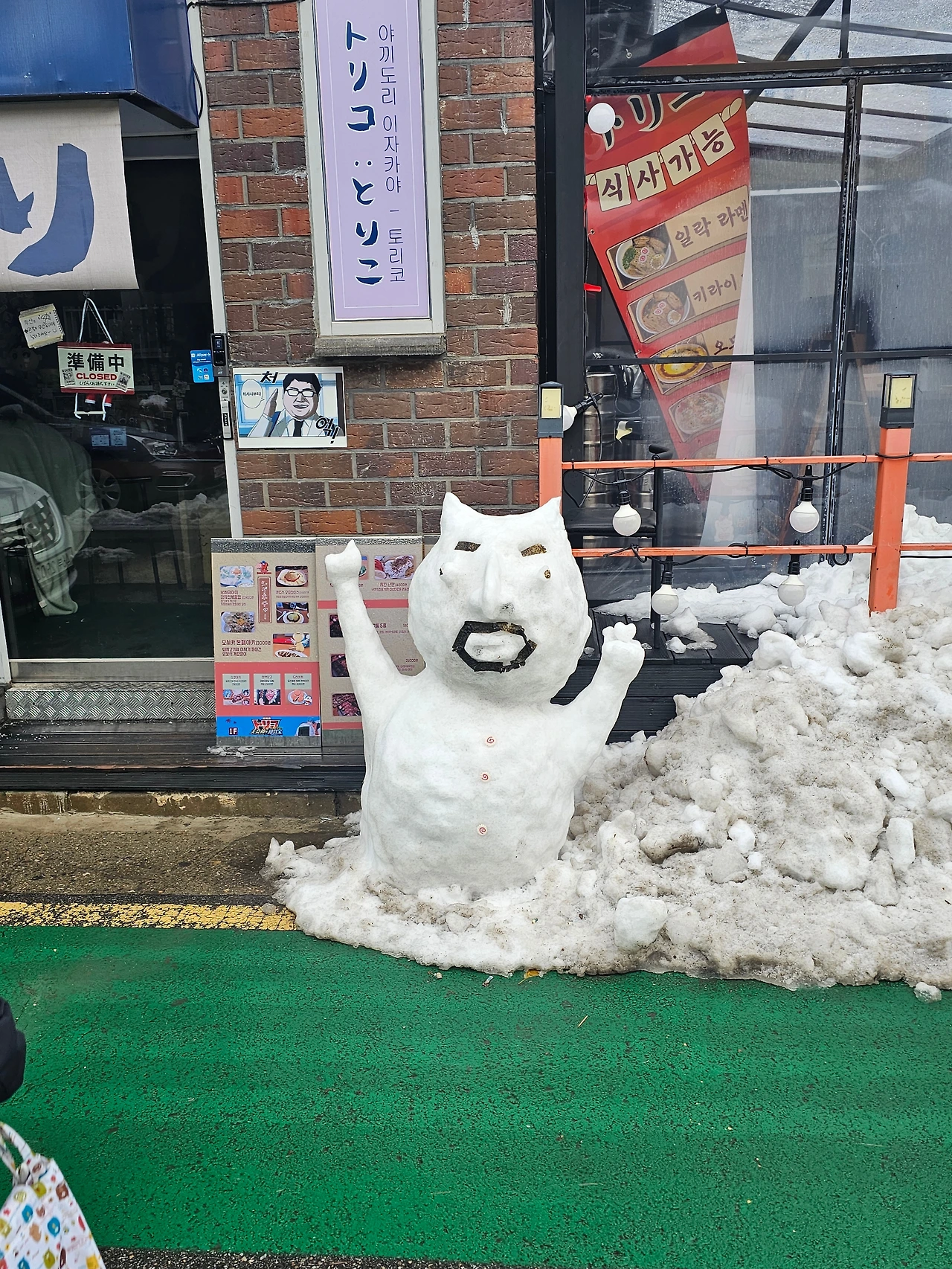 밥을 다 먹고 지나가는데 토리코라는 식당 앞에 웃기게 생긴 눈사람이 있었다 ㅎㅎ요 근래 눈이 많이 와서 출근하기 힘들었지만 새하얗게 소복이 쌓인 눈과 귀여운 눈사람을 만나니 괜스레 기분이 좋았다. 어른이 되면 출퇴근이 힘들어지니 눈이 싫어지기 마련이라는데 아직 눈이 좋은 걸 보면 내 안에 아직 낭만이 살아있나 보다 ㅎㅎ