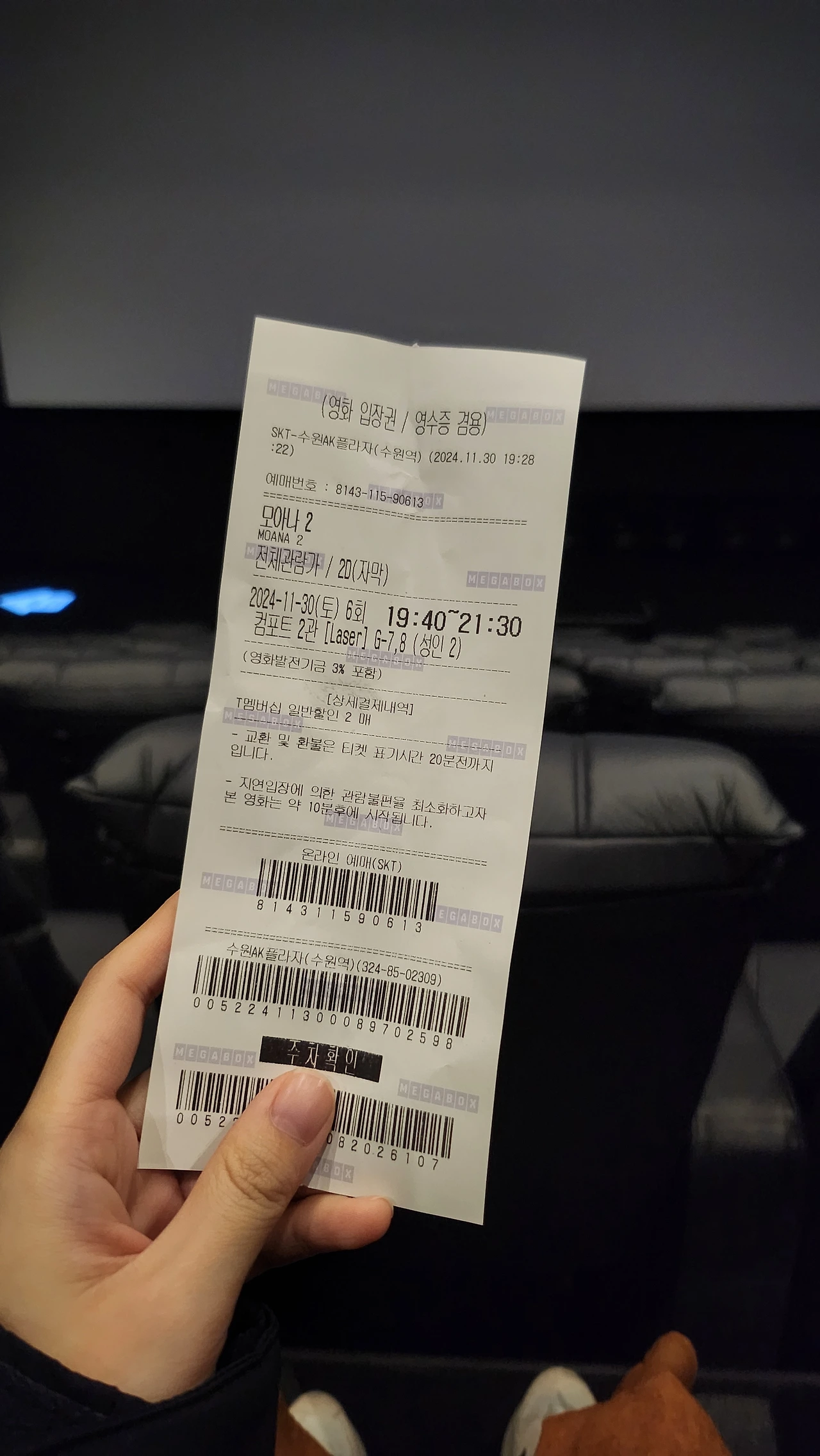 아파트 임장 다 도니 거의 15000보..ㅎㅎ다리가 아프니 이제 앉아 쉴 수 있는 데이트 하러 가본다. 점심도 2시 넘어 먹어서 저녁 대신 영화 선택! 영화는 모아나 2인데 킬링타임용으로 좋았던 것 같다. 디즈니를 둘 다 좋아해서 다행이야.